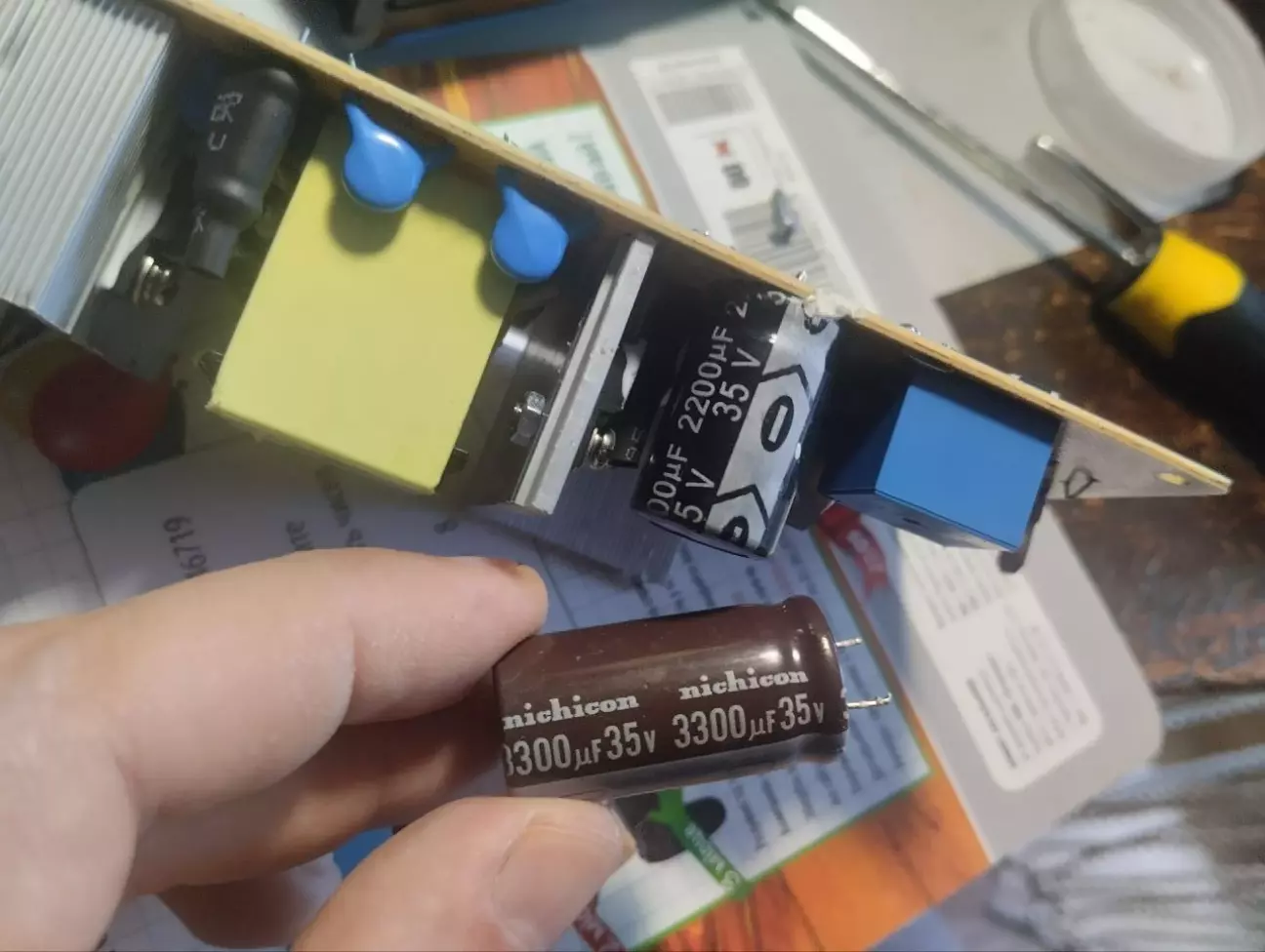 Замінено конденсатори на більший чи такий же номінал,нові,якісні,збільшеного вольтажу.
