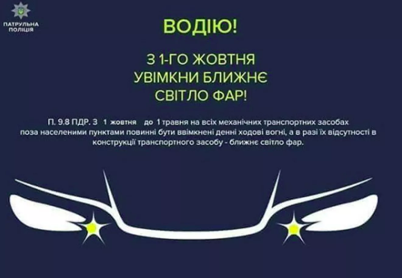 Прес-служба ГУ Національної поліції повідомляє: Відповідно до пункту 9.8 Правил дорожнього руху, щорічно з 1 жовтня по 1 травня це положення є обов’язковим для виконання. За ігнорування цієї норми передбачено штраф у розмірі 425 гривень.