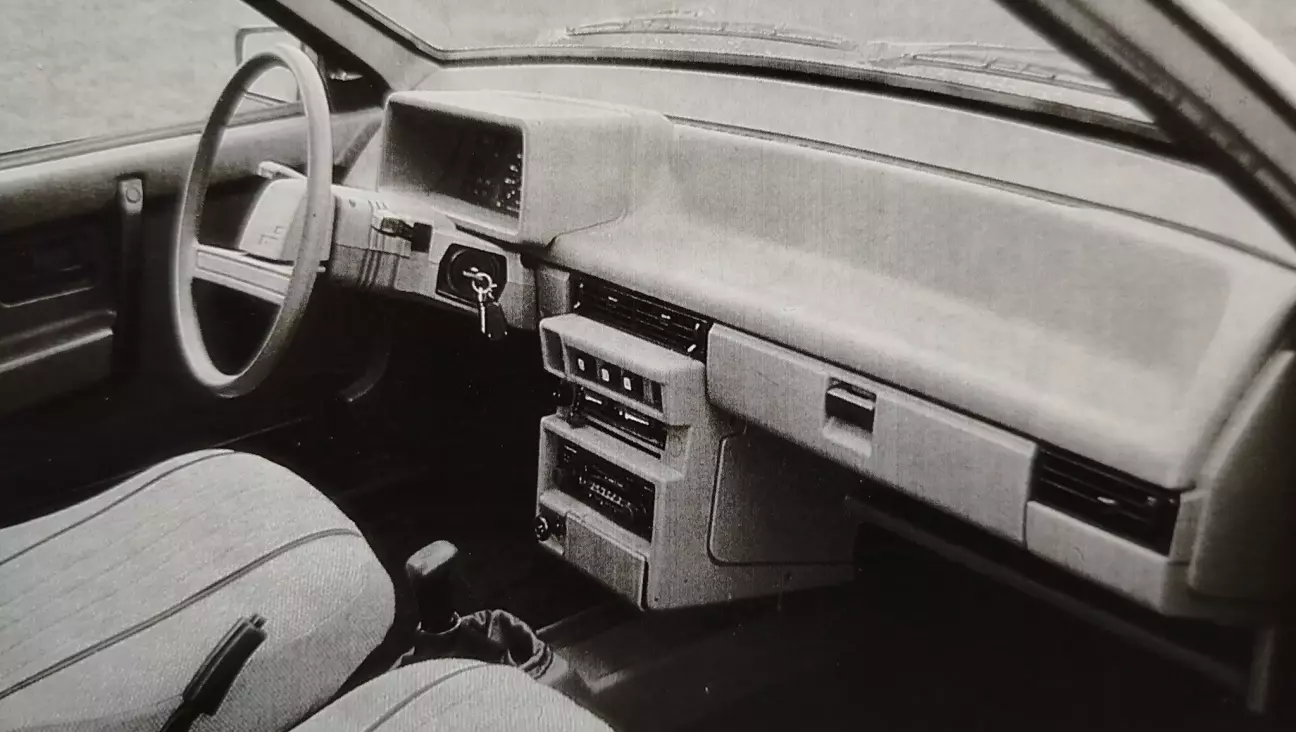 Её главное преимущество — это цена. Раздавленная. Смятая. Судите сами: в базовой версии она примерно на 10 000 франков дешевле своих одноклассников того же размера: R9, 309, Escort, Golf и т. д. Иными словами, она находится на уровне меньших автомобилей: R5, Panda, Metro, Polo. Какова эта базовая версия? Она менее «голая», чем можно было бы опасаться: внутренняя гармония цвета «табак», подходящая ткань в рубчик, складное заднее сиденье, оснащение, к которому мы ещё вернёмся. Конечно, глядя на приборную панель, которая так же лишена вдохновения, как и дверные панели, обтянутые пластиком, и на «скелетный» руль, нужно постоянно повторять себе в уме: «на десять тысяч меньше, на десять тысяч меньше...», чтобы не падать духом.