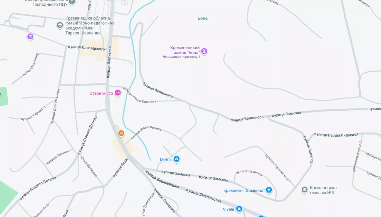 Їдучи вулицею Шевченка (на карті зверху вниз), до замку Бона ви поїдете по Кривоноса, чи одразу по Замковій?