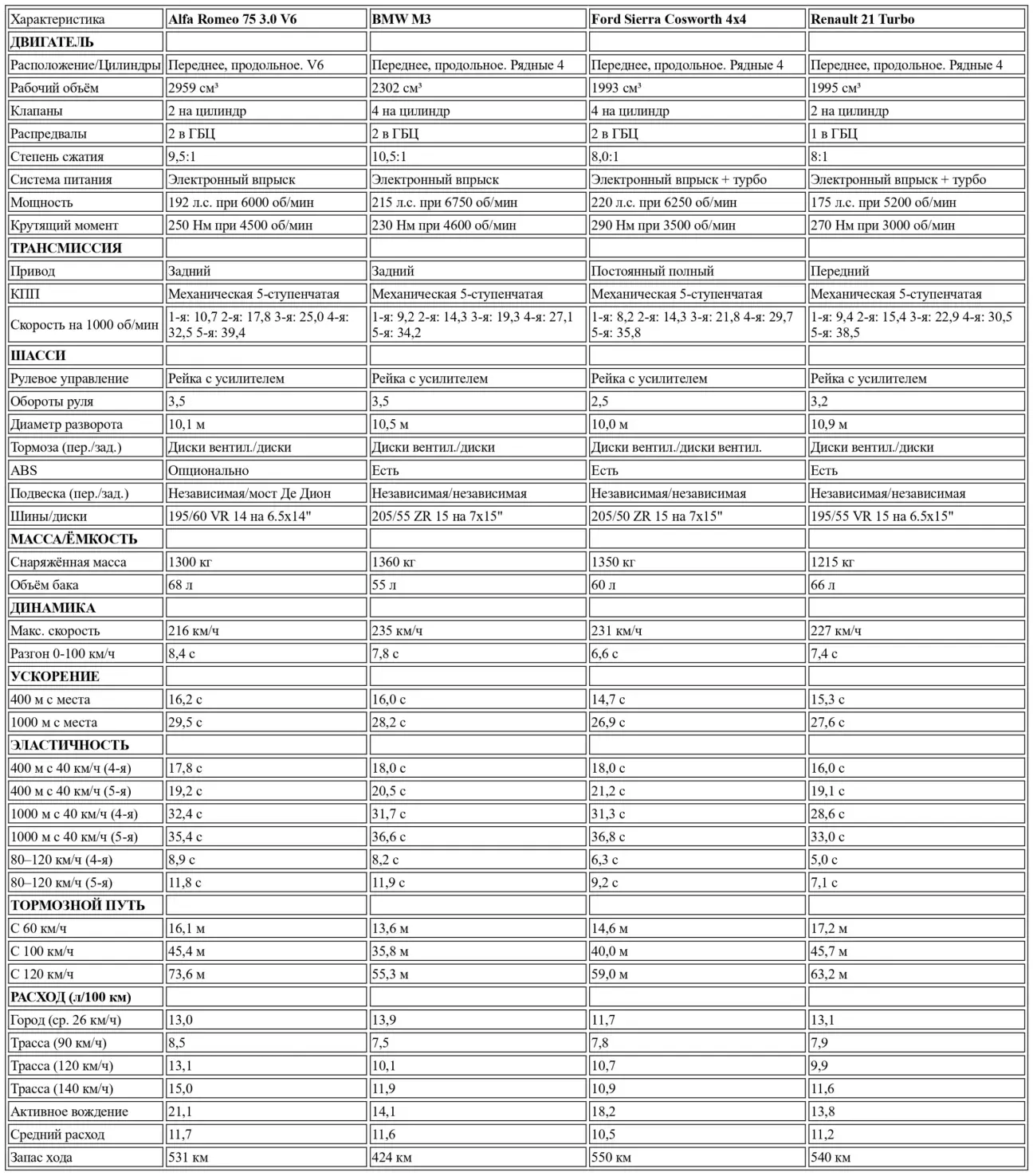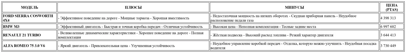 В заключение, ещё раз подчеркнём, что это необычный сравнительный тест, который имеет очень мало общего с теми, что мы обычно проводим, из-за столь разных характеристик каждой модели. В качестве итогового резюме можно сказать, что Sierra Cosworth 4x4 является наиболее эффективным, когда от её двигателя требуется максимум, кроме того, для любителей спортивного вождения она предлагает очень хорошую цену с передовыми техническими решениями. BMW M3 имеет сенсационный двигатель, но её утяжеляет чрезмерная цена. В свою очередь, Renault 21 и Alfa Romeo 75 лучше приспособлены для семейного использования и имеют самую доступную цену.
