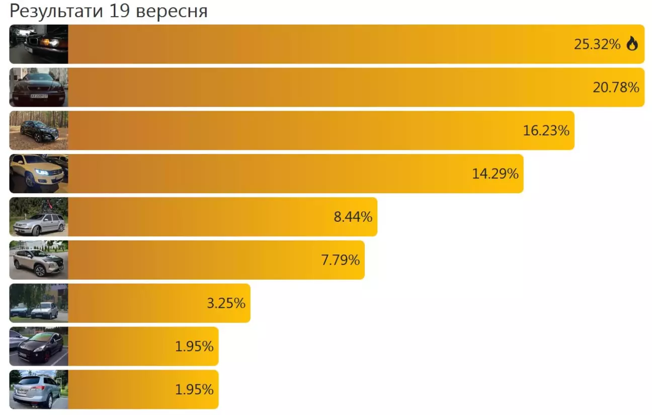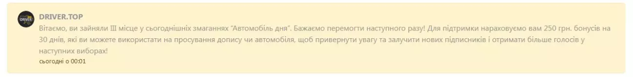 Всіх вітаю. Закінчилося голосування Авто дня 19.09.2025. Результат трішки гірший ніж минулого разу, але третє почесне місце теж гарний результат. Приз за третє місце такий самий як і за друге 250 грн на рахунок який можна використати для просування авто. Я задоволений результатом. Дякую всім хто підтримав і відав голос за моє авто
