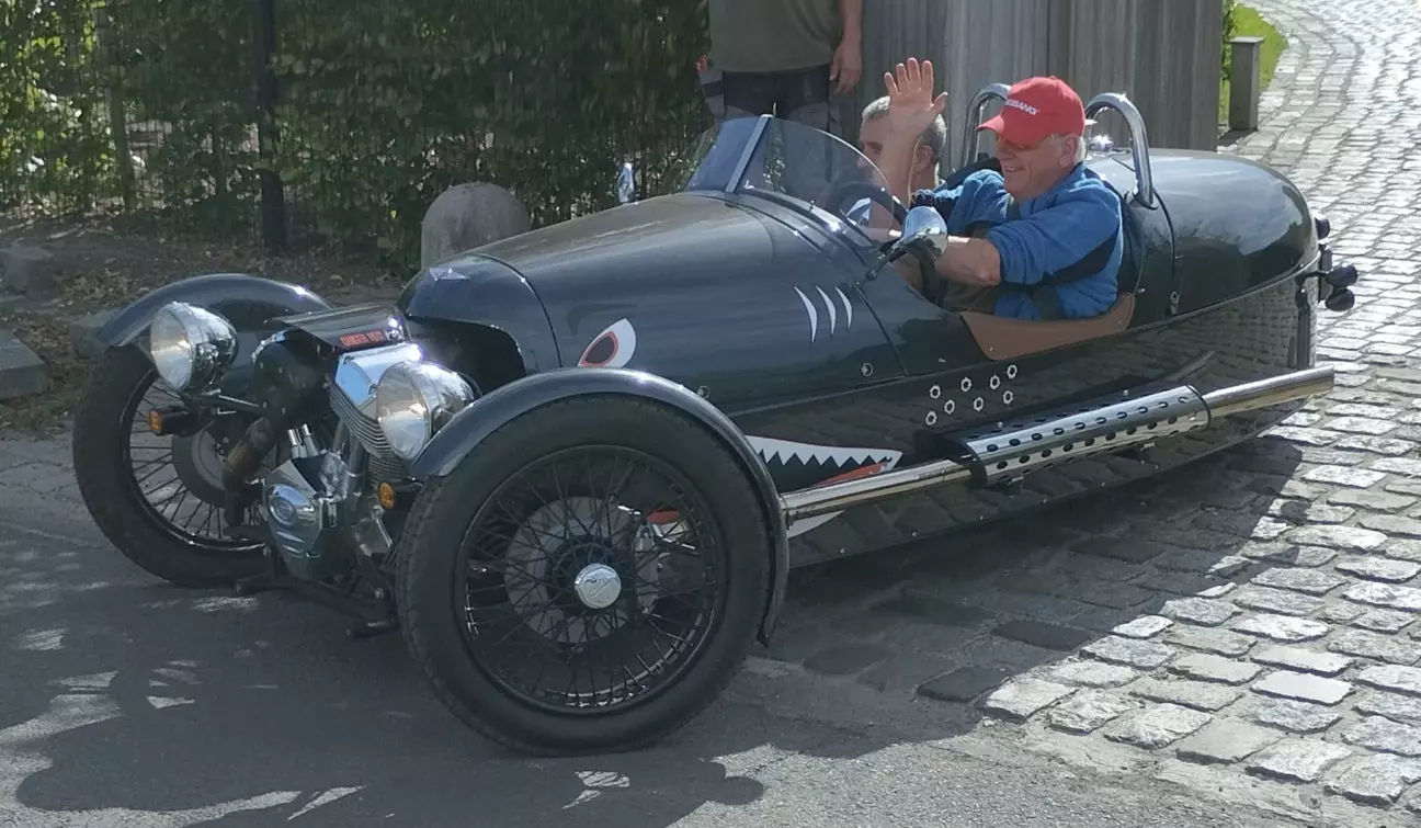 На зображенні Morgan 3 Wheeler, триколісний родстер, що вироблявся британською компанією Morgan Motor Company з 2012 по 2021 рік.