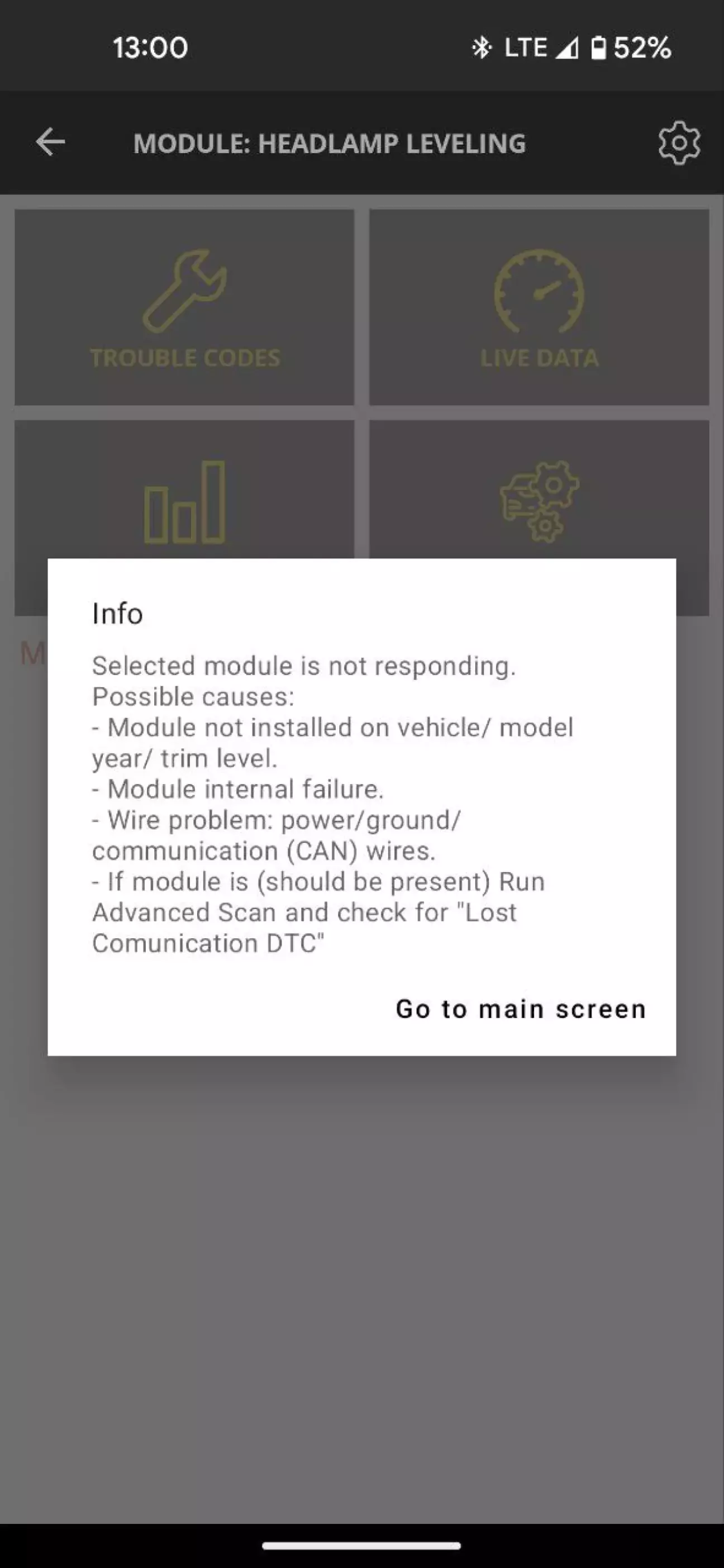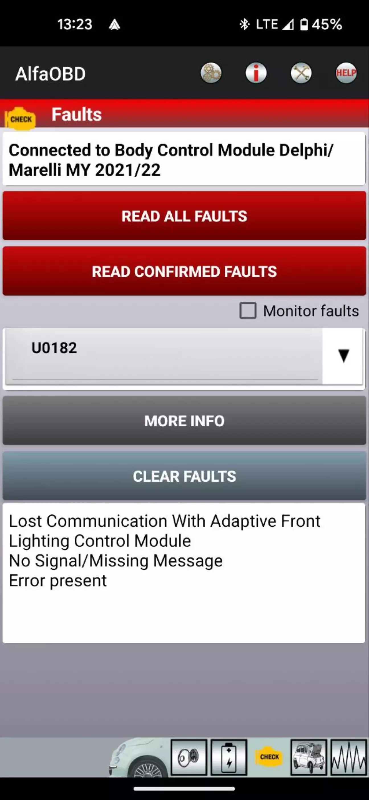 Далі вирішив закруглятись й від’єднав усе обладнання. Після від’єднання блока AFLM В якийсь момент, який я точно не зафіксував, у BCM з’явилася помилка U0182 — Lost communication with Adaptive Front Lighting Control Module. З цього можна зробити висновок, що теоретично BCM знає про існування такого модуля, тож ситуація виглядає не безнадійною.