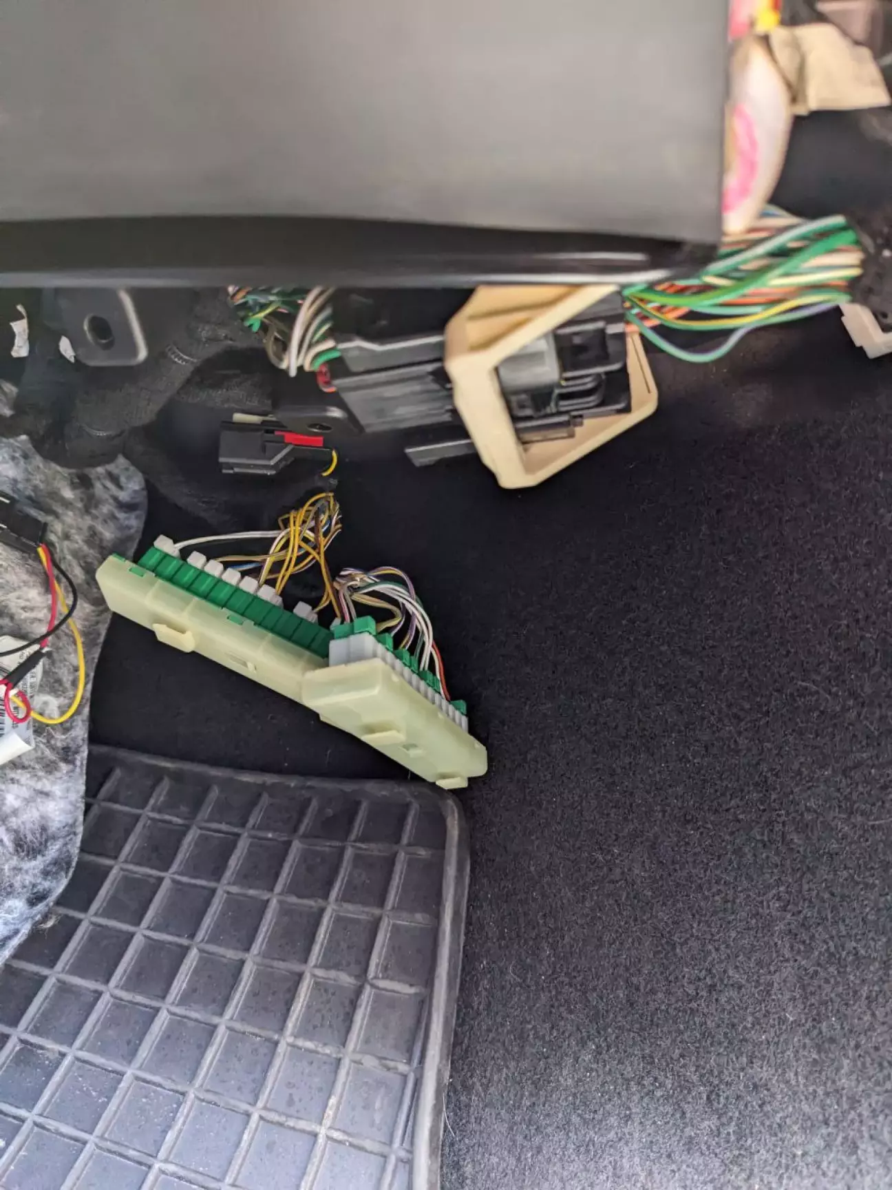Під’єднання робив тимчасово - шину CAN-C знайшов за бардачком, живлення напряму на акумулятор. Оскільки робив уперше, вирішив демонтувати весь бардачок. За інструкцією це робиться досить просто, хоча дістатися знизу до трьох саморізів виявилося не надто зручно. Втім, згодом з’ясувалося, що знімати сам бардачок не обов’язково - до колодок CAN цілком реально дотягнутися й без цього.