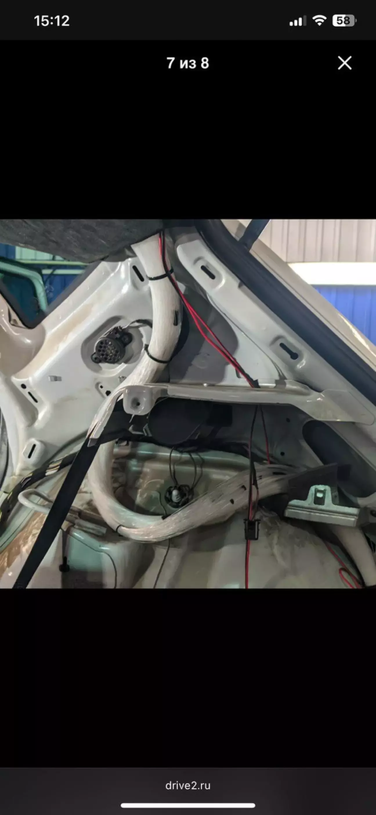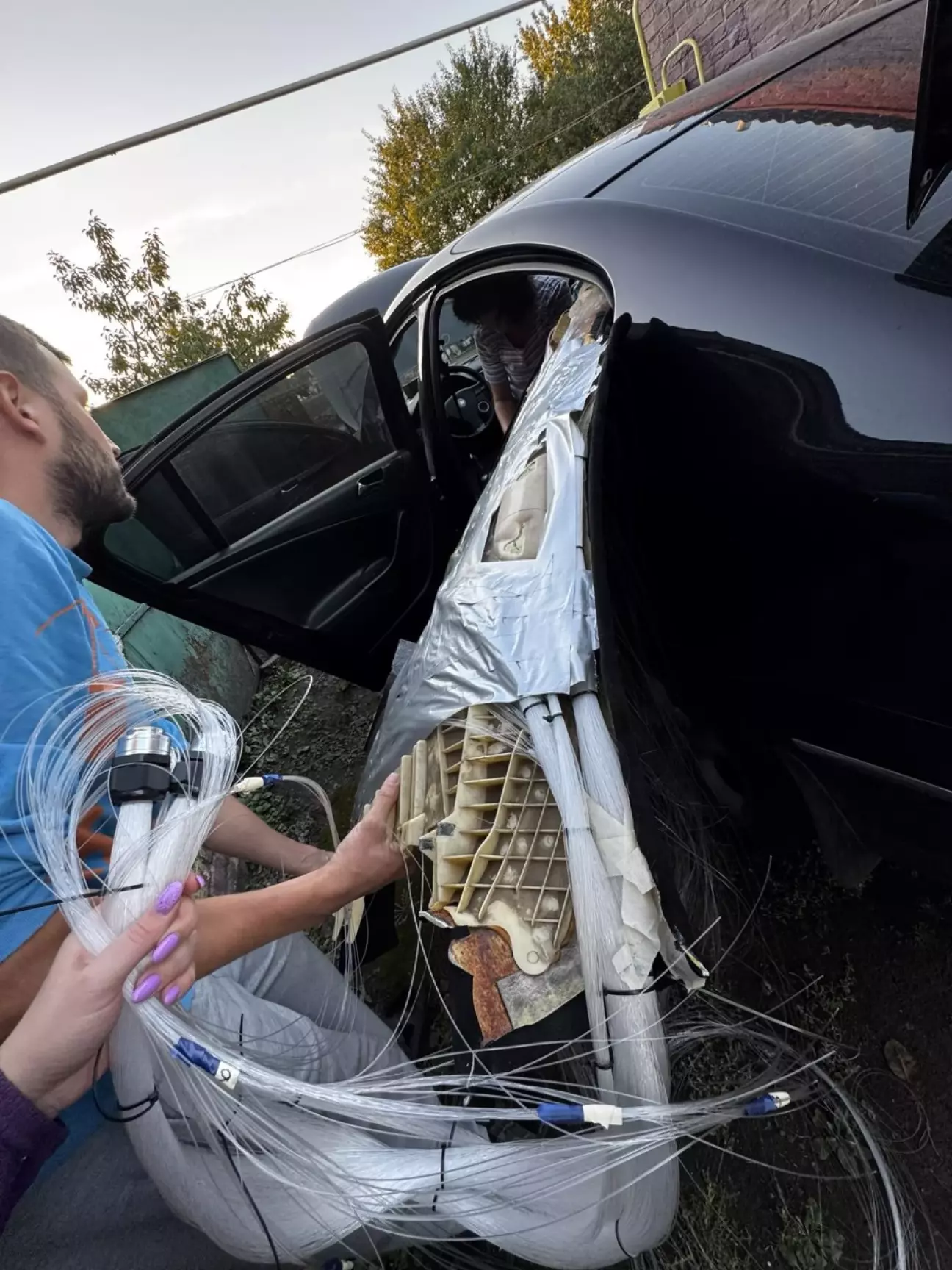 Для люка брал обычную дрель . Работа долгая и ещё раз долгая, кто надеется сделать это за пару часов то вы ошибаетесь, вставил первые 500 волокон и запутались волокна, все достал и по новой, уже с третьей попытки рассчитал что блок будет лежать в багажнике и нужно оставить 80-90 см жгута для прокладывания через заднюю правую стойку.
