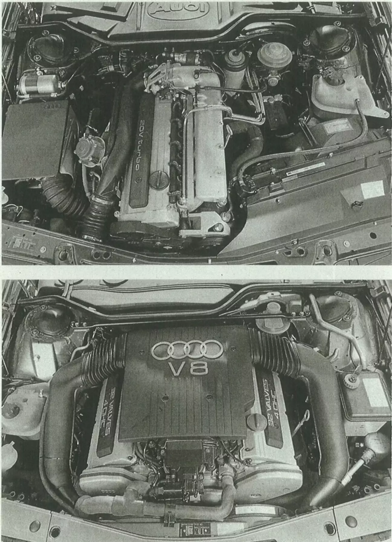 Две альтернативы на вершине модельного ряда Ауди играют свои роли с разной степенью убедительности. Ауди V8, как роскошный автомобиль, убеждает своей культурой езды, первоклассным оснащением и свойствами полного привода, но по производительности она всё же отстаёт от своей более темпераментной конкурентки. Ауди 200 Quattro 20V очень уверенно отвечает требованиям к производительности, предъявляемым к её классу. Она является прекрасным примером спортивного туристического седана и с таким характером в большей степени соответствует пожеланиям клиентуры, которая хочет оставаться мобильной на мощном полноприводном автомобиле и в альпийскую зиму. С этой точки зрения, у Ауди «пять» стоит больше, чем «восемь».