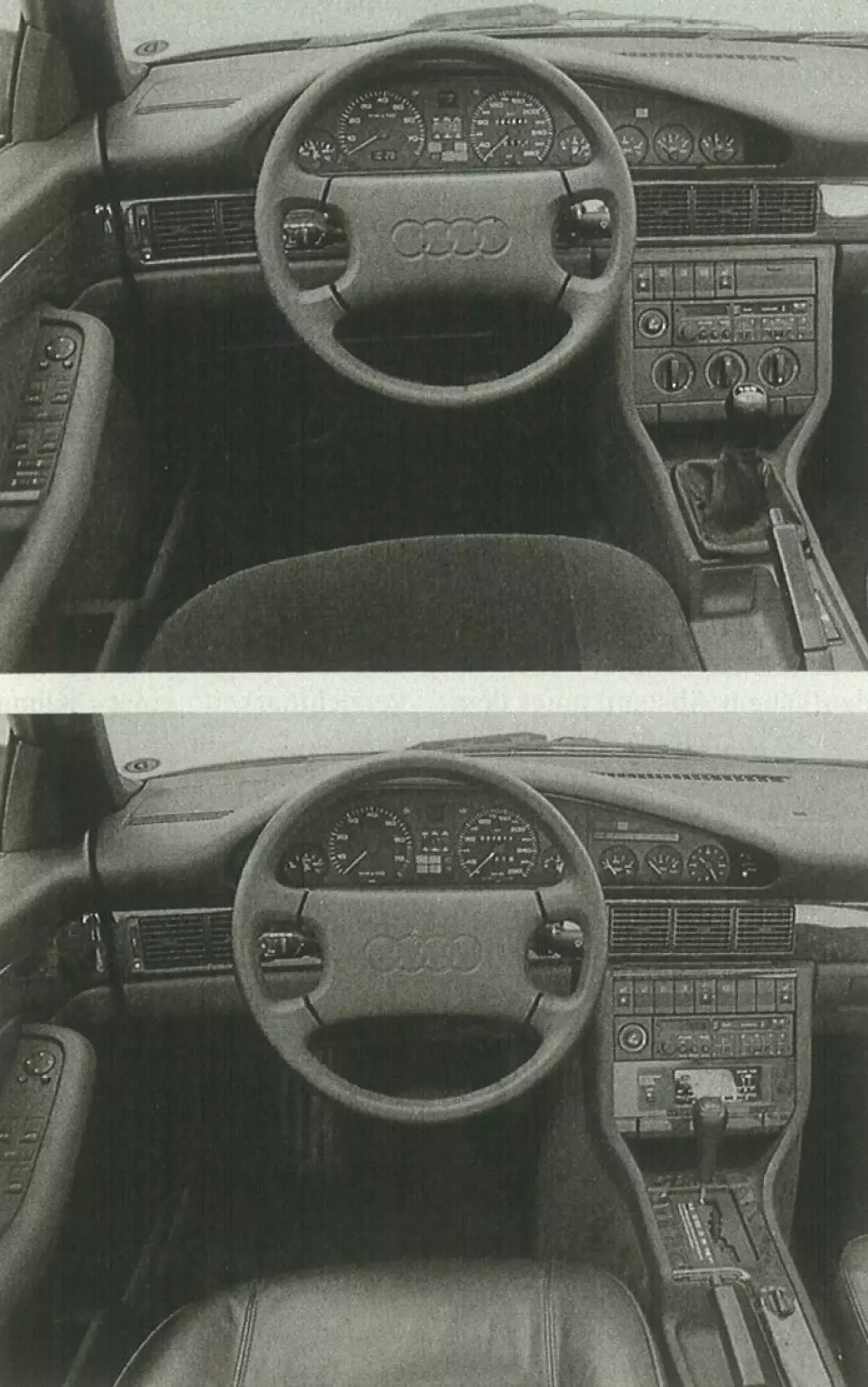 Фактическая разница в цене в 14 000 марок разделяет обе Ауди сильнее, чем реальные обстоятельства. Дважды одна и та же базовая конструкция кузова, естественно, предлагает одинаковое пространство. И дважды одинаково большие оконные проёмы дарят в каждой из этих больших Ауди особенно долгое лето и убеждение в незаменимости кондиционера. В остальном в салоне при одинаковом оснащении царит и одинаковое ощущение благосостояния. То, что деревянная отделка в V8 выглядит более «молодой», а в Ауди 200 — более «пожилой», ставит вопрос о том, нужна ли древесина в автомобиле. Возможно, тропическая, из находящихся под угрозой исчезновения дождевых лесов, и только в двух оттенках.