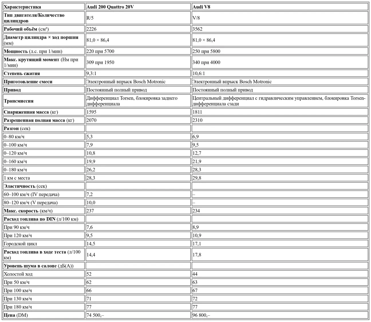 Этот предрассудок обе Ауди подтверждают удивительно убедительными замерами. Пятицилиндровый двигатель выигрывает дуэль на трассе с большим отрывом. Он заканчивает короткий спринт от нуля до 100 км/ч за 7,9 секунды — упражнение, на которое восьмицилиндровая модель тратит почти на две секунды больше времени. Разница становится ещё более очевидной в длинном спринте от нуля до 200 км/ч, который Ауди 200 проходит за 39,9 секунды, в то время как V8 требуется 46,5 секунды. Скорее для порядка приводится и сравнение максимальной скорости: Ауди 200 Quattro — 237 км/ч, Ауди V8 — 234 км/ч.