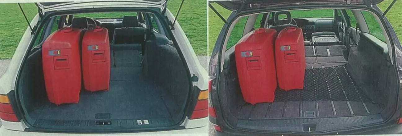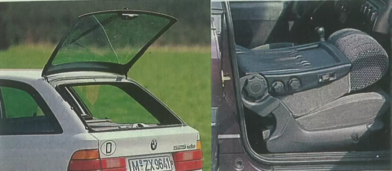 Кроме того, Опель практичнее. Ведь его дополнительно складывающаяся спинка переднего пассажирского сиденья — как и у универсала Volvo 850 — при необходимости позволяет перевозить даже слаломные шесты, в то время как откидывающееся заднее стекло у «пятёрки» Touring — не более чем модный трюк, скопированный с американских «универсалов». Ведь при движении с открытым задним окном выхлопные газы попадают в салон.