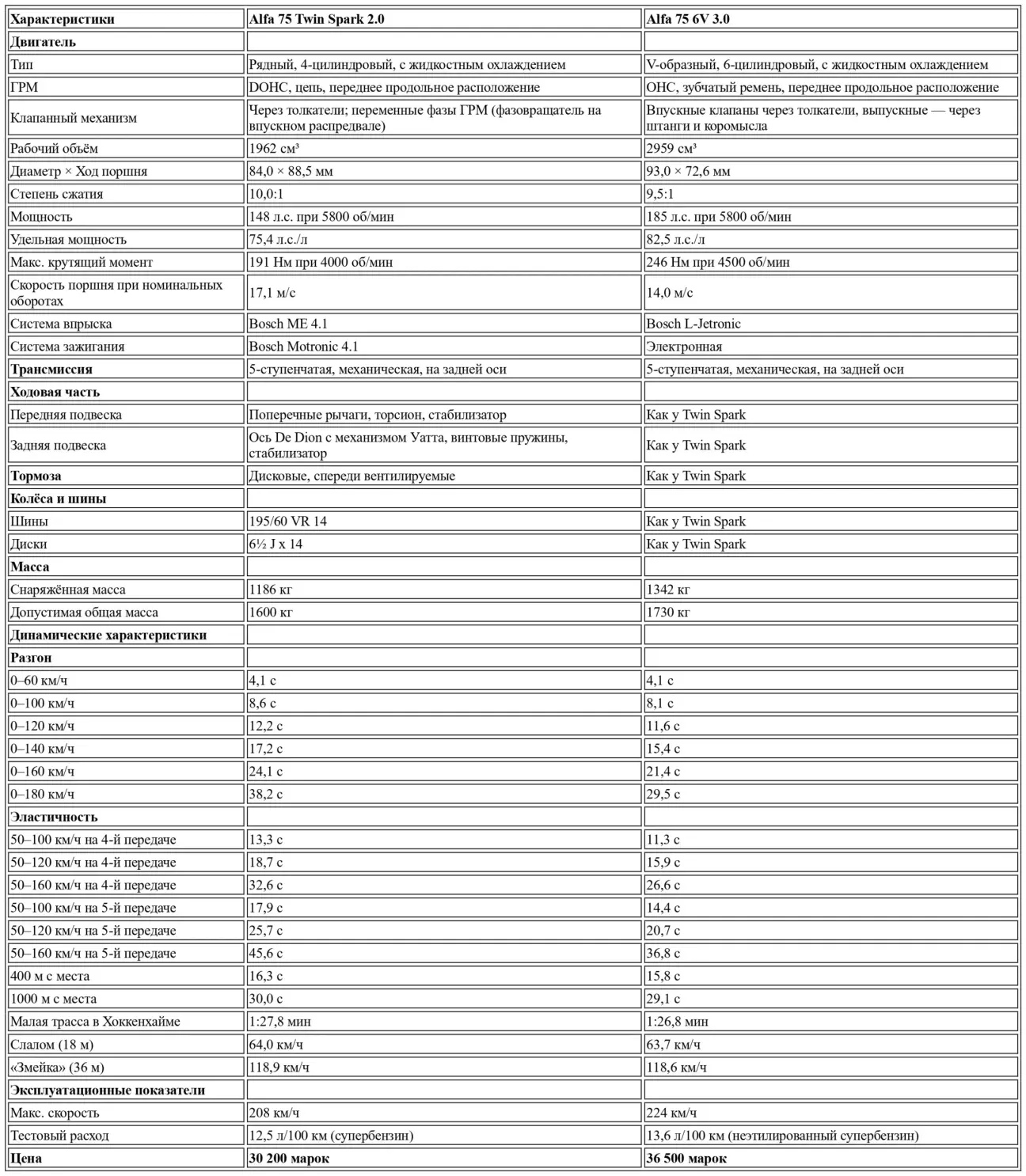 Двигатель Twin Spark, во всяком случае, берётся за дело с традиционной энергичностью четырёхцилиндрового мотора Альфы, но без его традиционных недостатков, и с добродетелью предвкушения, конечно, жаждешь того дня, когда этот темпераментный мотор будет также «рвать» пейзаж на Alfa Spider. V6, напротив, действует скорее с неторопливостью состоятельного хозяина траттории, который хоть и не обделяет своих гостей вниманием, но которому не хватает живой проворности его «младших» собратьев с меньшим рабочим объёмом. 188 л.с. при 5800 об/мин и максимальный крутящий момент 250 Нм при 4500 об/мин — это, конечно, слова «насилия», которые, однако, нивелируются бо́льшим весом Alfa 75 3.0 (взвешенных 1343 килограмма; Twin Spark — 1145 килограммов) и более длинным передаточным числом задней оси.