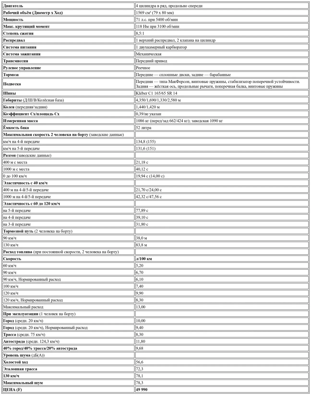 Этот седан оснащён четырёхцилиндровым двигателем родом с Лады. С первых же метров задаёшься вопросом, действительно ли мощность автомобиля соответствует заявленной. Действительно, очень длинные передаточные числа не позволяют в полной мере использовать потенциал мотора. Максимальная скорость достигается на четвёртой передаче, а пятая, являясь повышающей, называется «экономичной». Зато эта коробка передач очень приятна в использовании, она чёткая, с короткой, прямой и точной кулисой. Тормоза вполне в пределах нормы, при условии, что не постесняться сильно нажать на педаль.