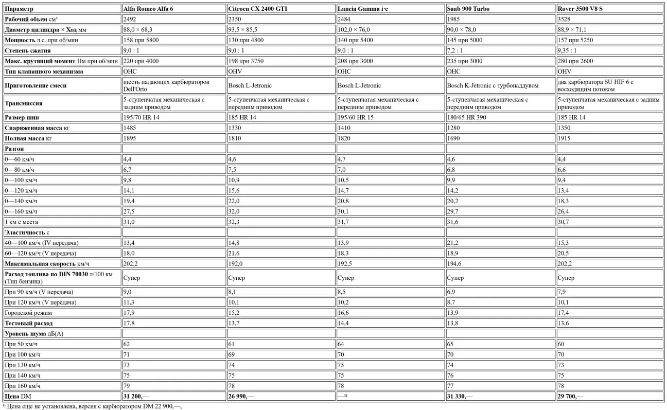 Перевод теста-сравнения Alfa Romeo Alfa 6, Citroën CX 2400 GTI, Lancia Gamma i.e., Rover 3500 S, Saab 900 Turbo от немецкого автомобильного журнального издания Auto Motor und Sport, № 23, 1980.