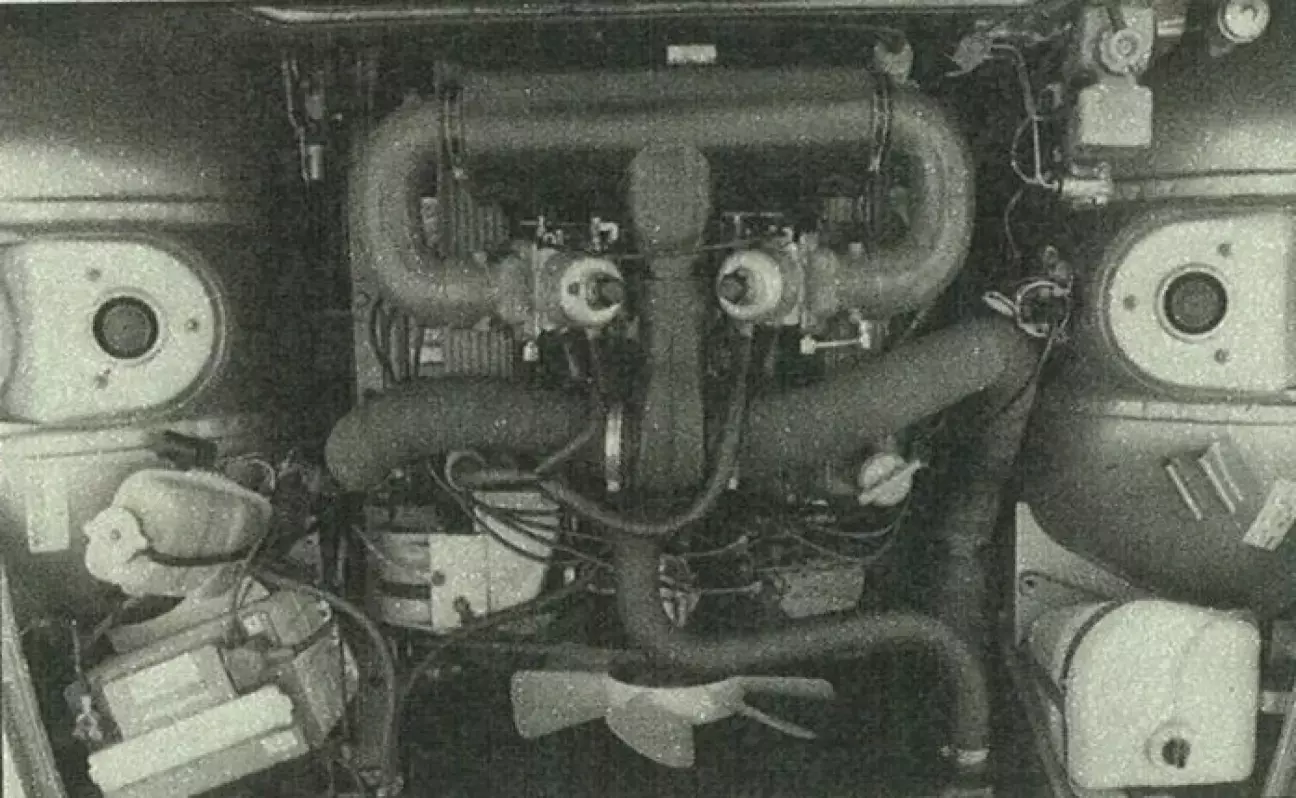 Двигатель: Четырёхцилиндровый оппозитный двигатель с жидкостным охлаждением, продольное расположение спереди, коленчатый вал на трёх опорах, по одному верхнему распределительному валу на каждый ряд цилиндров.