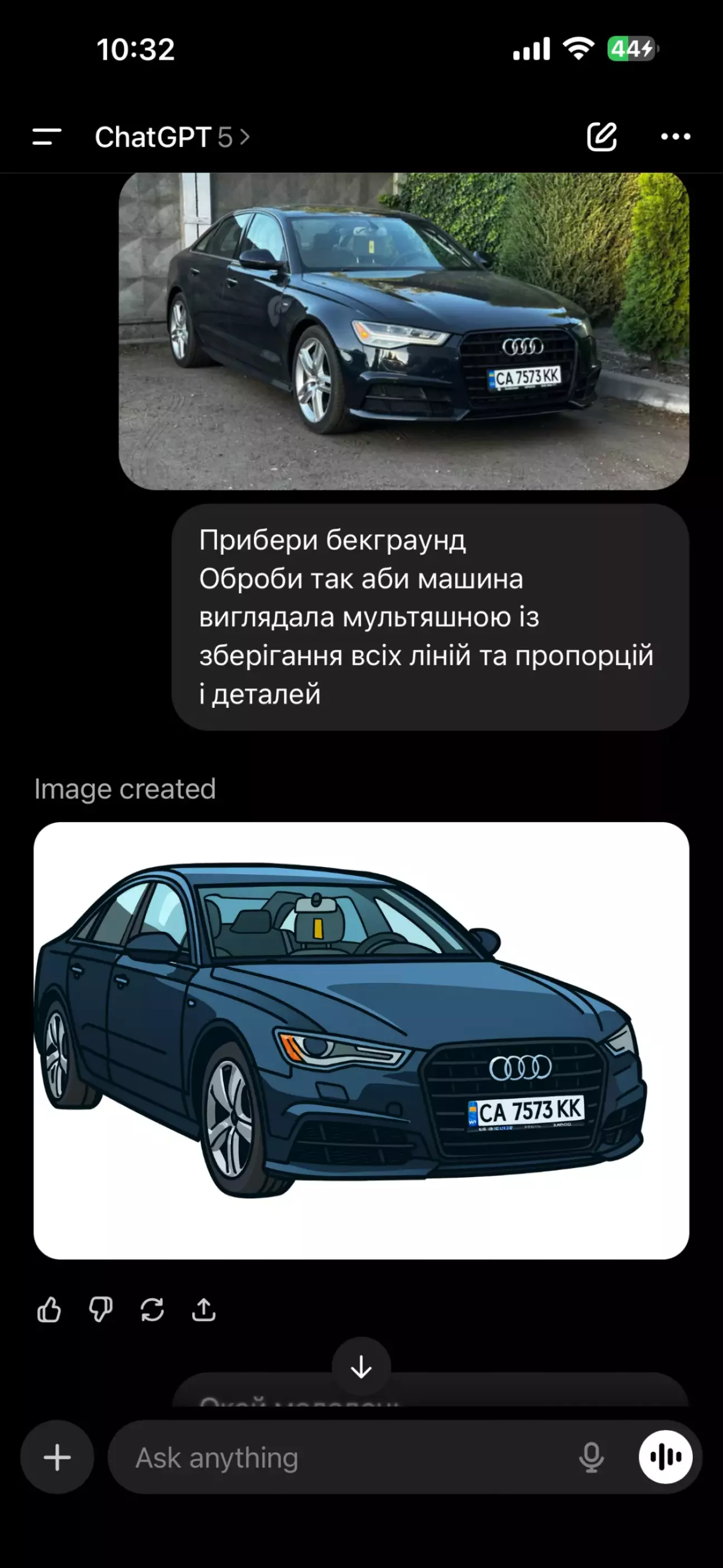 Крок 1. Йдемо в ChatGPT, кидаємо фото вашої машини та коротку інструкцію: що саме хочете бачити на екрані (логотип, напис, стиль, кольори — усе ваше).