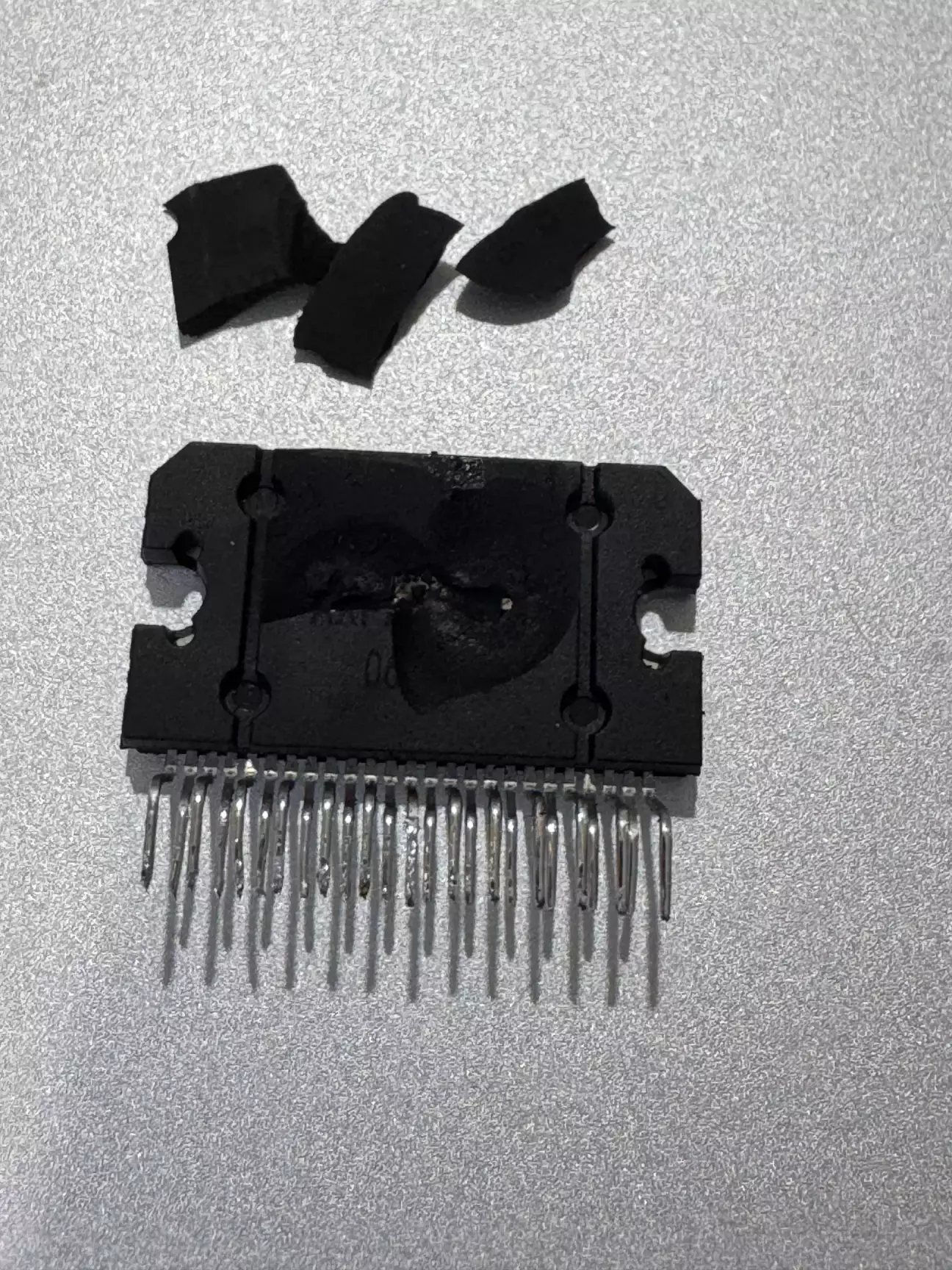 Мосфет просто розірвало, це клон TDA7388, EnChip AXPA17388, на виходах 130Ом в робочого. В цього на виходах вийшла дірка.