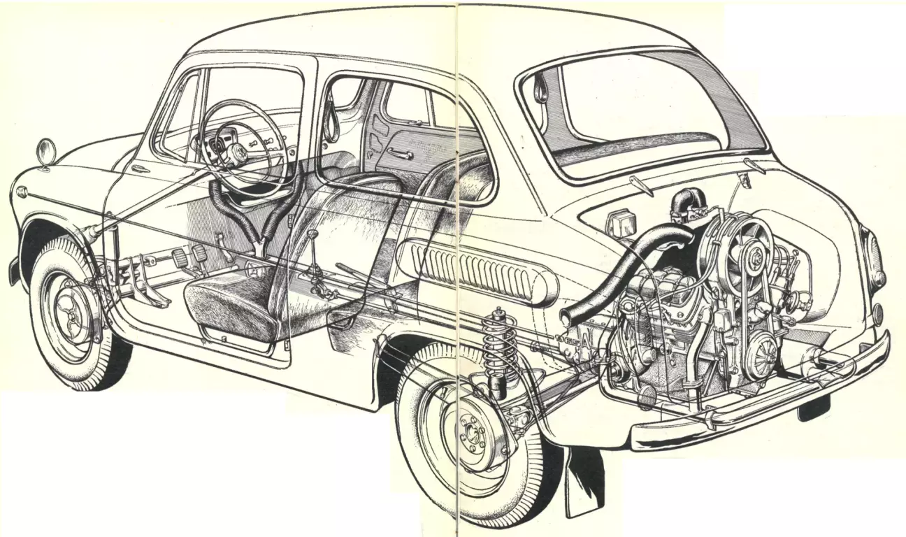 При более детальном рассмотрении конструкции «Ялты», например, с помощью чертежа в разрезе, необходимо отметить, что на её проектирование было потрачено много труда и знаний, поскольку конструктивно автомобиль выглядит продуманным и хорошим. Правда, его кузов, как по внешнему виду, так и с точки зрения использования пространства, по нынешним меркам устарел, о чём наиболее ясно свидетельствует маленький объём багажника и крепление дверных петель по заднему краю. Однако необходимо учитывать, что кузов в этом виде существует уже почти десять лет и при его проектировании в варианте Fiat 600 повсеместно считался отличным примером хорошего использования пространства и грамотного дизайна.