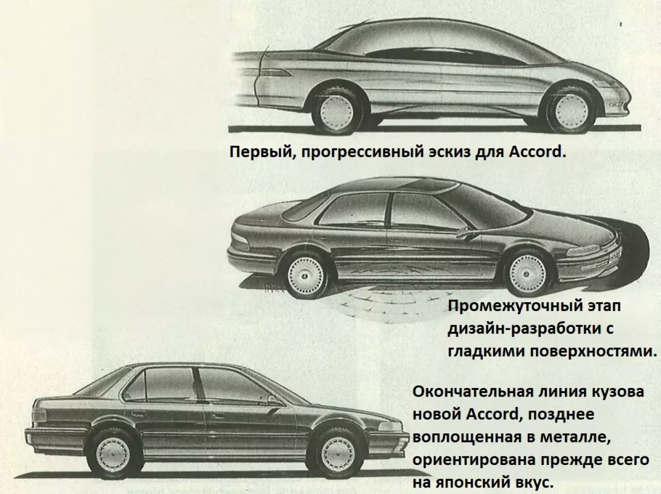 Сохранение формальной и технической самобытности среди всех японских марок делало Honda привлекательной в Европе, особенно в Германии. Однако на прибыльном японском рынке самый молодой японский автопроизводитель — бывший главный разработчик Nobuhiko Kawamoto отметил: «Мы строим автомобили 26 лет, Mercedes — 103 года» — начал терять уважение и долю рынка. В результате, японские специалисты по сбыту смогли настоять на своей форме Honda Accord 1990: она должна нравиться не европейцам, а в первую очередь японцам. А в Америке всё, что исходит от Honda, и так пользуется высочайшим уважением. Вот почему прогрессивный эскиз (вверху) через привлекательную вторую стадию разработки (посередине) в конечном счете превратился в японское "всякое-разное", или в обычную "японку" (внизу).