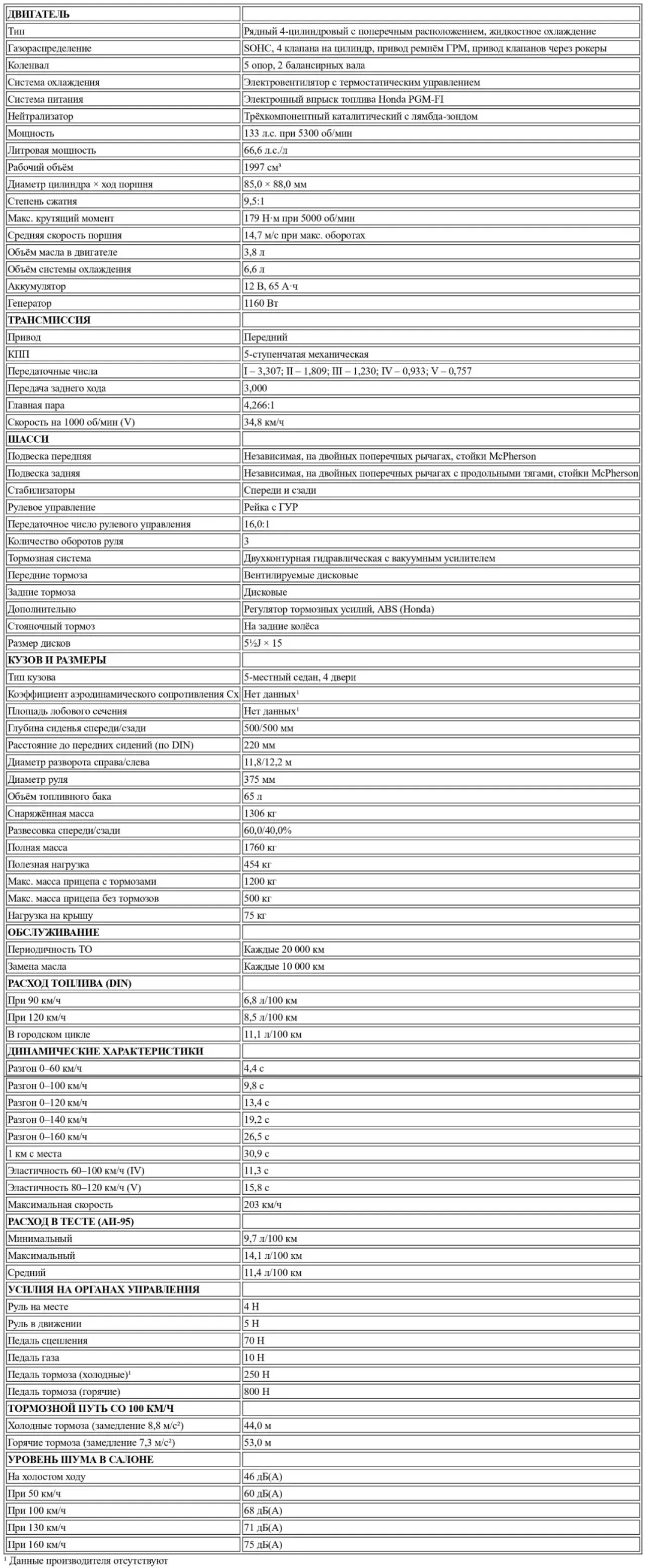 Динамические характеристики подтверждают субъективное впечатление. 15,8 секунды, которые требуются Accord 2.0i для разгона с 80 до 120 км/ч на пятой передаче, являются средним результатом. Снаряженная масса в 1,3 тонны, обусловленная богатой комфортной комплектацией с многочисленными электромоторами, а также длинно нарезанная пятая передача, не позволяют показать лучший результат. Таким образом, приходится много работать рычагом. Это доставляет удовольствие, поскольку тросовый привод переключения передач работает очень четко. При желании можно разогнаться до 100 км/ч с места примерно за 10 секунд. А максимальная скорость, превышающая 200 км/ч, не дает повода для нареканий. Приемлемые показатели и у расхода топлива. 11,4 литра неэтилированного Super на 100 километров — это норма для класса, как и 14 литров на 100 километров при активной езде.