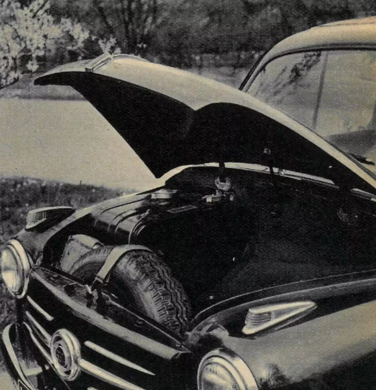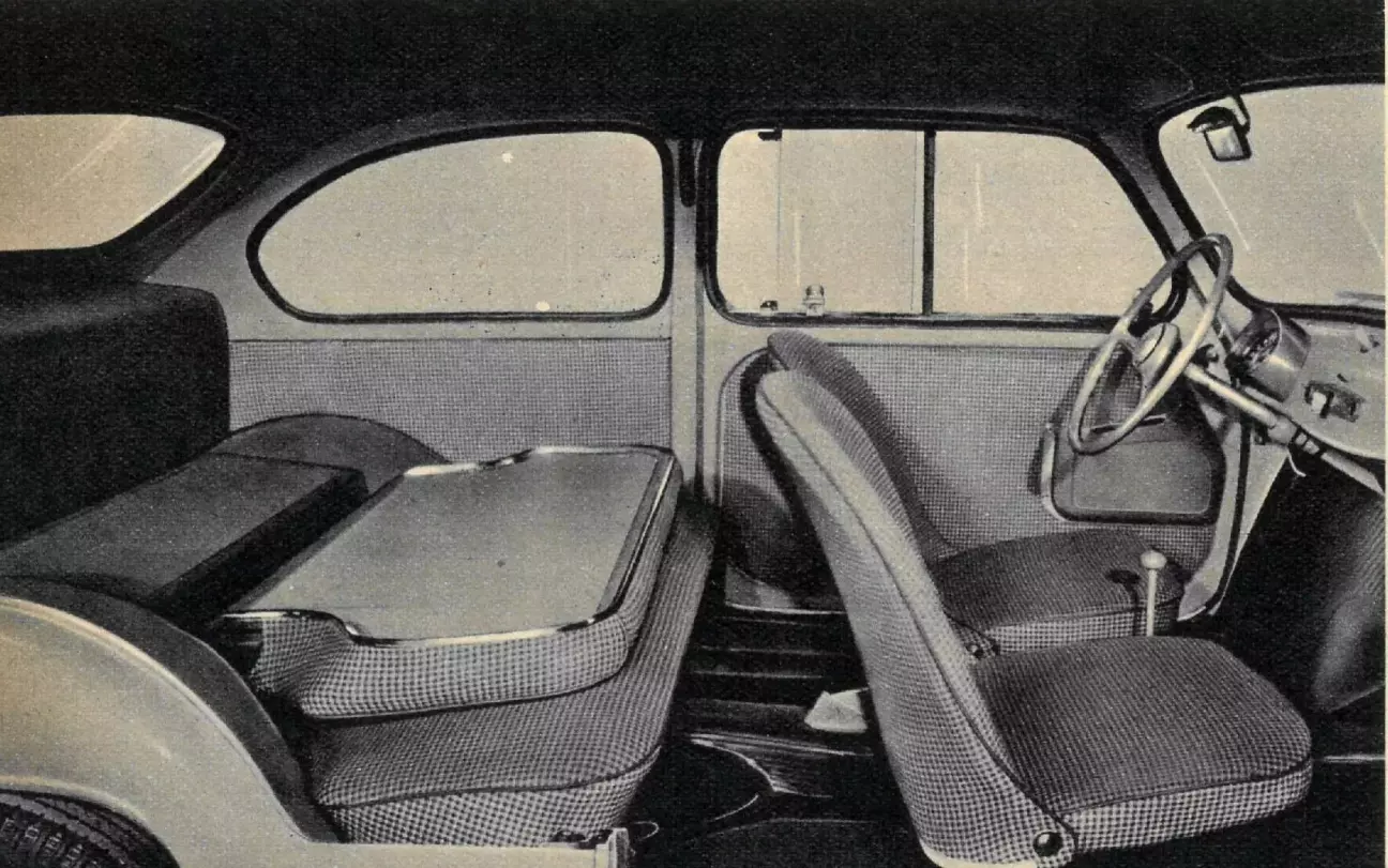 Вопрос багажного отделения, критерий каждого заднемоторного автомобиля, здесь решен особенно умело. Для недельной экспедиции с четырьмя взрослыми людьми Fiat 600, естественно, не подходит. Но супружеская пара с одним или двумя детьми может без проблем отправиться на нем в отпускное путешествие. За задним сиденьем все-таки помещается вполне приличный чемодан вместе с небольшим багажом, который также можно разместить под передним капотом, где, кроме того, находится топливный бак, запасное колесо, инструменты, а также — скрытно — аккумулятор и бачок тормозной жидкости.