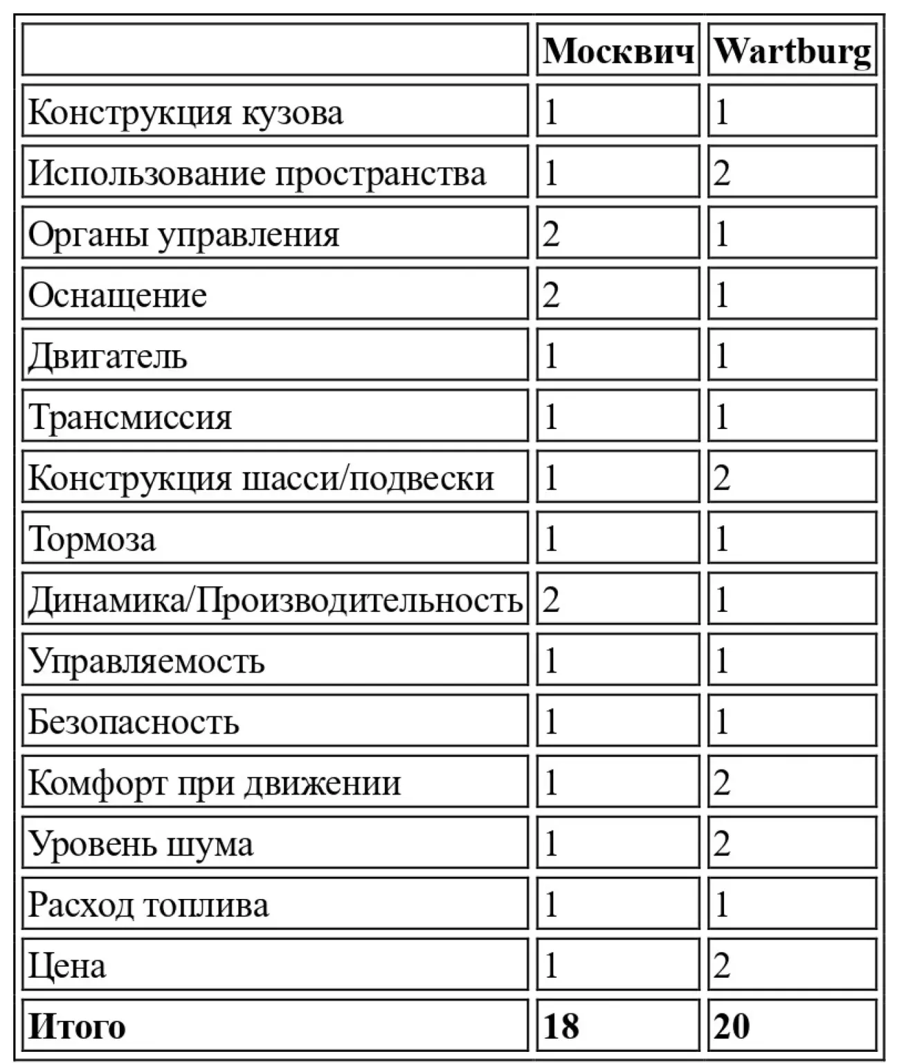 Wartburg на этот раз — мой явный фаворит. Он предлагает для семейного использования более просторный и комфортабельный салон (тканевые сиденья), чем Москвич. Особенно велик багажный отсек. Литровый двухтактник вполне достаточно резво возит Wartburg, и играть с маслом тоже можно научиться. На минусовой стороне наиболее сильно сказываются несколько своеобразное поведение в поворотах и негерметичность кузова. Хотя, конечно, размер минуса сильно сжимается, когда заглядываешь в ценник.