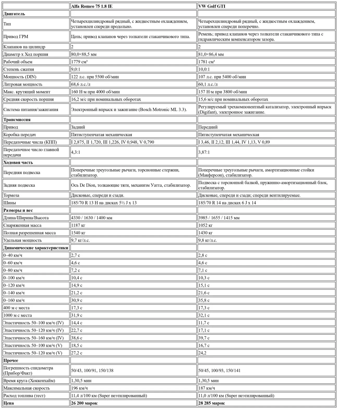 Но для начала эти двое совершенно трезво выступают в качестве претендентов на одну и ту же целевую группу. GTI годами считался любимой игрушкой хорошо зарабатывающих служащих. С конца 1988 года за 28 285 марок ему противостоит Alfa 75 1.8 IE, которая предлагает на 15 л.с. больше за 26 200 марок. Однако в то время как Golf из соображений здравого смысла пожертвовал семью из своих первоначальных лошадиных сил ради установки регулируемого катализатора, Alfa, несмотря на отличные предпосылки (впрыск и электронное управление двигателем), к сожалению, не желает присоединяться к «зеленому» тренду.