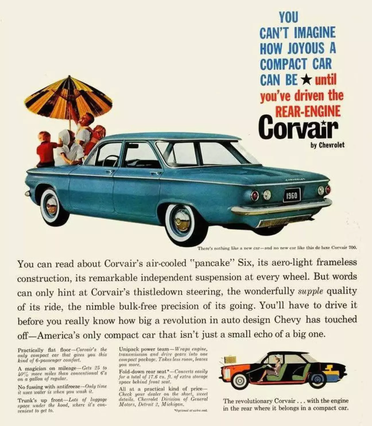 Ідею, очевидно, запозичили у Volkswagen Beetle, але в процесі адаптації задньомоторної схеми до американських стандартів комфорту й місткості довелося діяти методом спроб і помилок.