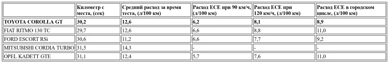 В плане эластичности она также показала высокие результаты, конечно, при поддержке ультракороткой трансмиссии. Она «проглотила» дистанции 400 и 1000 м со старта на 40 км/ч за 18,3 и 33,4 сек. на четвертой передаче, в то время как хронометр остановился на 19,9 и 36,8 секундах на пятой. Излишне говорить, что скорости, достигнутые к концу километра, были блестящими: 165 км/ч на четвертой и не менее 149 км/ч на пятой. Последнее испытание выявило эластичность этого замечательного двигателя, поскольку разгоны не вызвали никаких сбоев в работе кривошипно-шатунного механизма! Если разгон и эластичность выигрывают от передаточных чисел коробки, последние могут влиять на максимальную скорость автомобиля. Этого не произошло, поскольку Corolla GT достигла скорости 193,97 км/ч на пятой передаче при 6735 об/мин, что близко к оборотам максимальной мощности. Итак...