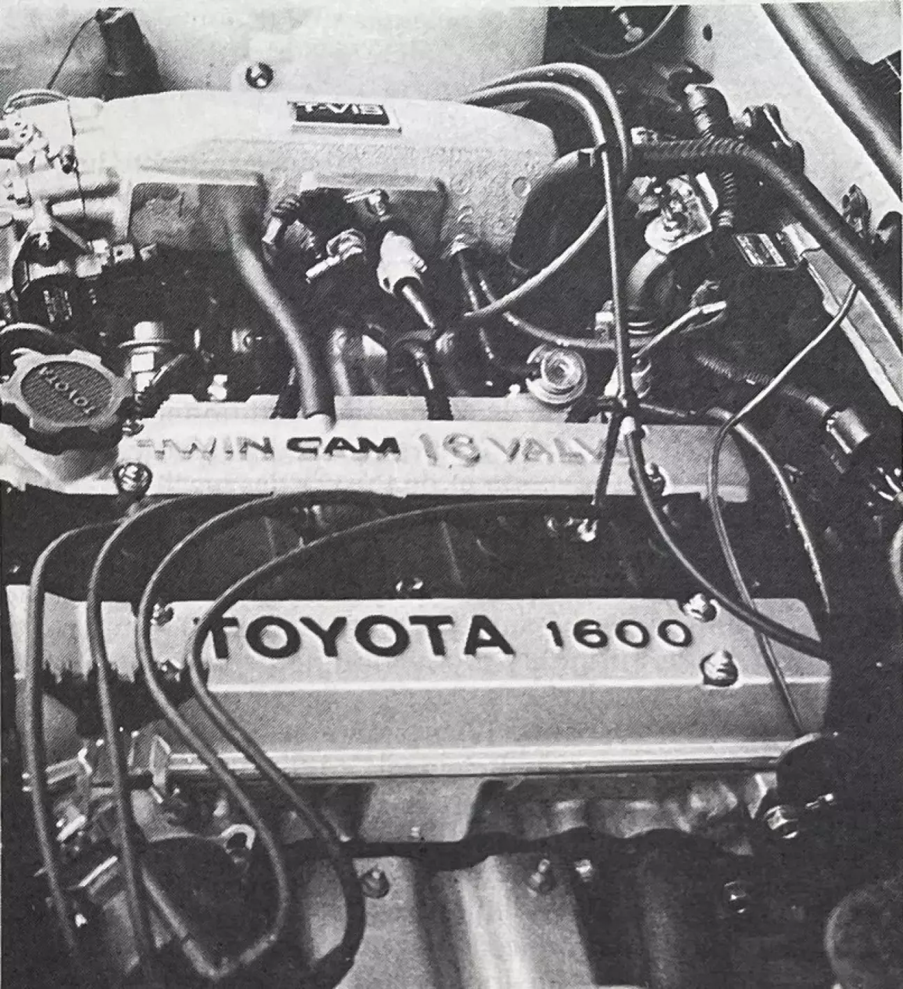 Блок увенчан головкой блока цилиндров из сплава, имеющей характерный вид. Она не может скрыть два распределительных вала, которые она содержит, как из-за своей раздвоенной формы, так и из-за... букв, гордо нанесенных на крышки клапанов. Эти валы приводятся в действие цепью от коленчатого вала. Эта технология идентична той, которая использовалась в старых Corolla GT с двигателем 2T-G. Головка блока цилиндров имеет 4 клапана на цилиндр: два для впуска и два для выпуска. Эта технология очень ценится в спортивных автомобилях для лучшего «дыхания» цилиндров. Но у нее есть недостатки. Она приводит к большему расходу топлива, способствует увеличению мощности на высоких оборотах, ущемляя низкие и средние обороты. И, кроме того, она обычно создает более высокий уровень шума.