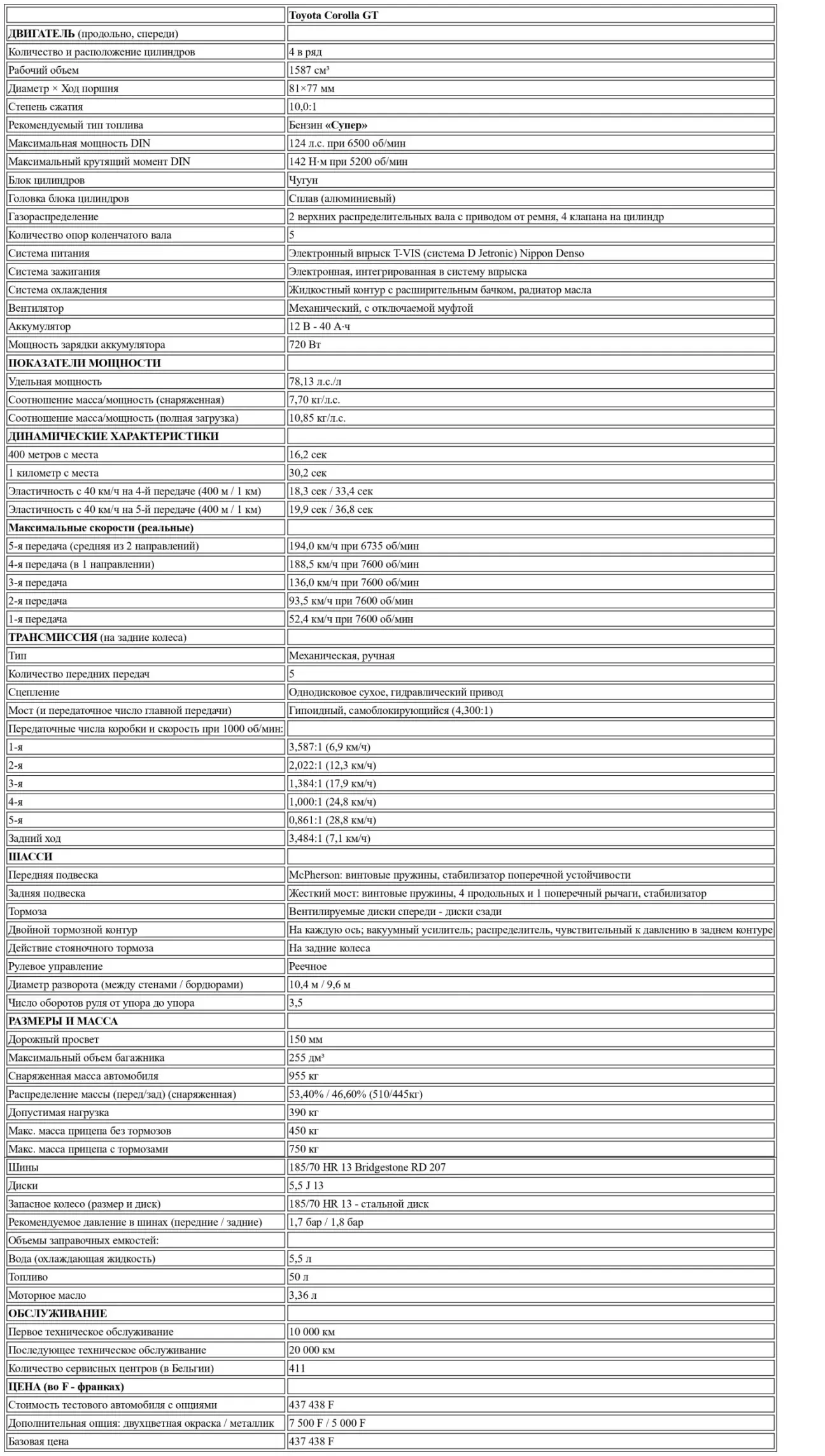 Corolla GT позиционируется как решительно спортивный автомобиль, по крайней мере, в том виде, в каком она импортируется в Бельгию. Легкий кузов, не лишенный стиля (форма лифтбэк, вероятно, была бы немного более функциональной), ультракороткая трансмиссия, дифференциал повышенного трения, не забывая о душе этого автомобиля — 16-клапанном двигателе, поддерживаемом электроникой (которая управляет впрыском, подачей воздуха, зажиганием, диагностическим контролем). Corolla GT обладает высокими характеристиками, но требует больших навыков пилотирования, чтобы не быть застигнутым врасплох. Она демонстрирует отличное сцепление с дорогой, но навязывает слишком острое поведение для того, чтобы быть безопасным и расслабляющим. Ее мотор работает эффективно, создавая в салоне слишком высокий уровень шума, чтобы быть терпимым при длительных поездках. Невозможно, например, услышать автомагнитолу, даже увеличив громкость до точки насыщения динамиков. Этот портрет на наш взгляд определяет стиль водителя, который требует Corolla GT. Она меньше подойдет любителям скорости на дорогах общего пользования, чем молодым спортсменам. Последние также оценят ее более чем доступную цену, тем более, что она включает множество обычно дорогостоящих опций.