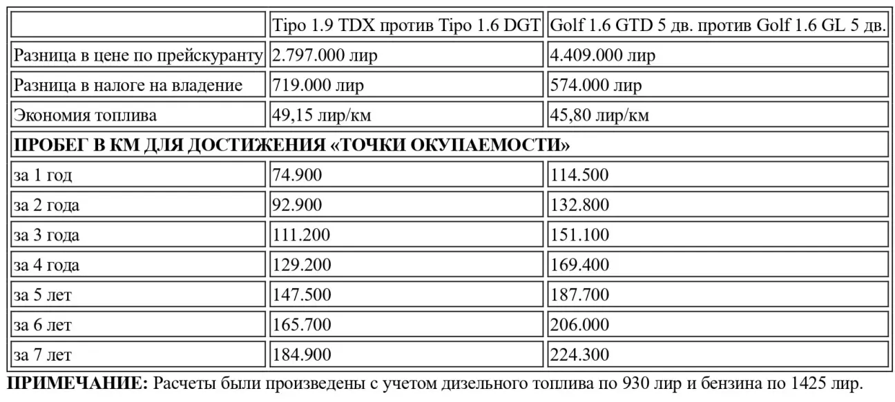 Данные, которые мы здесь предлагаем, подчеркивают минимальный годовой пробег, который пользователь турбодизельных версий должен проехать, чтобы компенсировать за счет экономии, связанной с меньшей стоимостью дизельного топлива, более высокие расходы на покупку и «сверхналог» (увеличенный налог на владение) по сравнению с эквивалентными (по динамическим характеристикам и оснащению) бензиновыми версиями. «Tipo» имеет лучшую «точку окупаемости», чем «Golf», поскольку разница в цене, которую необходимо возместить, меньше, несмотря на более обременительный (тяжелый) налог на владение и несколько больший расход топлива из-за более высокого рабочего объема и мощности. Следовательно, тот, кто думает выбрать автомобиль с дизельным двигателем, поскольку считает его эксплуатационные расходы более экономичными по сравнению с аналогичной бензиновой моделью, должен тщательно оценить эти пробеги, принимая также во внимание сильное обесценивание, которому в настоящее время подвержен дизельный автомобиль.
