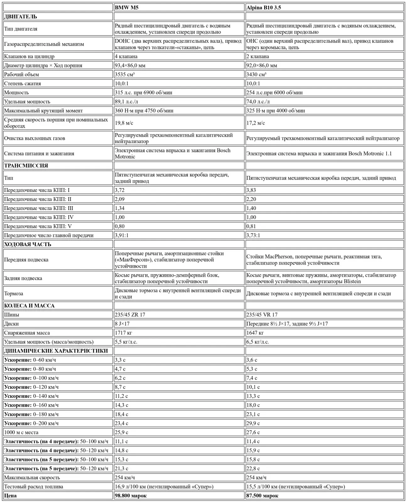Говорят, что глава BMW Эберхард фон Кюнхайм как-то сказал: «Daimler-Benz — крупнейший производитель грузовиков в мире, с весьма примечательным производством легковых автомобилей». По аналогии с этим тонко ироничным замечанием, можно отметить: глава Alpina Буркард Бовензипен — крупнейший продавец изысканных вин в Германии, с весьма примечательным производством автомобилей. Эти автомобили часто являются конкурентами. Поэтому «Sport Auto» пригласил обе вариации на тему 5-й серии для сравнительного теста. На первый взгляд это может показаться не совсем справедливым, поскольку M5 выступает с солидными 315 л.с., которые делают ее самым быстрым серийным седаном в мире, в то время как Alpina B10 3,5 довольствуется всего 254 л.с.