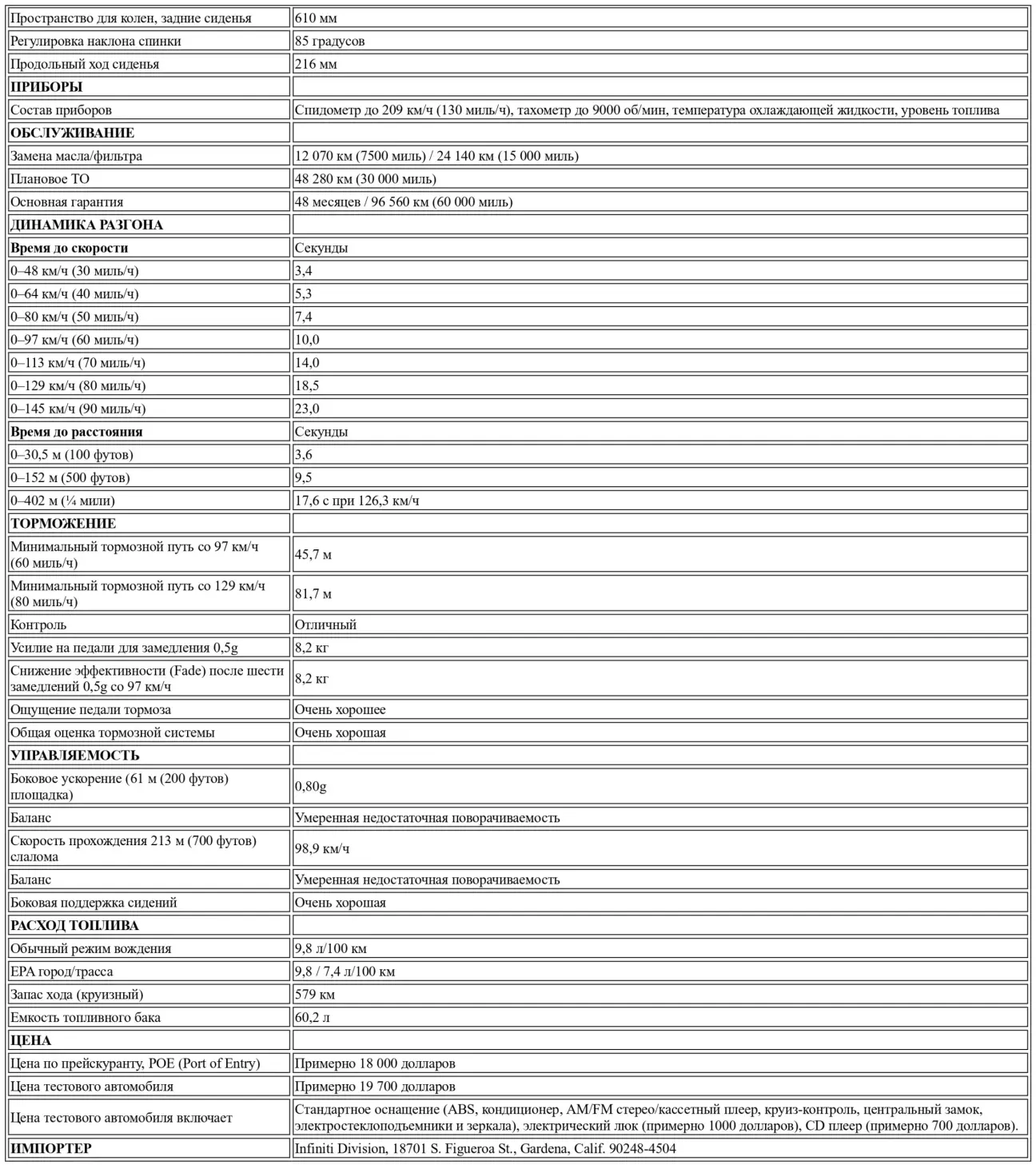 С места водителя все органы управления находятся в пределах легкой досягаемости, приятны на ощупь и работают с удовлетворяющим чувством и звуком — мягкий, приглушенный щелчок рычага указателя поворота и точный «клик» кнопок управления вентиляцией особенно радуют. Большие циферблаты спидометра и тахометра доминируют на приборной панели, с указателями уровня топлива и температуры воды слева. «Почему бы Infiniti не украсить шкалы цифрами с засечками, как на Q45?», — задавались вопросом мы все. Возможно, это мелочь, но недорогой способ заставить машину казаться немного более престижной. Радио — механизм, который для многих чаще всего подвергается настройке — расположено высоко на приборной панели, до него легко дотянуться, не наклоняясь вперед. Опциональный проигрыватель компакт-дисков установлен ниже всего, образуя «сэндвич» с освежающе простыми элементами управления обогревом/вентиляцией/кондиционированием воздуха посередине.