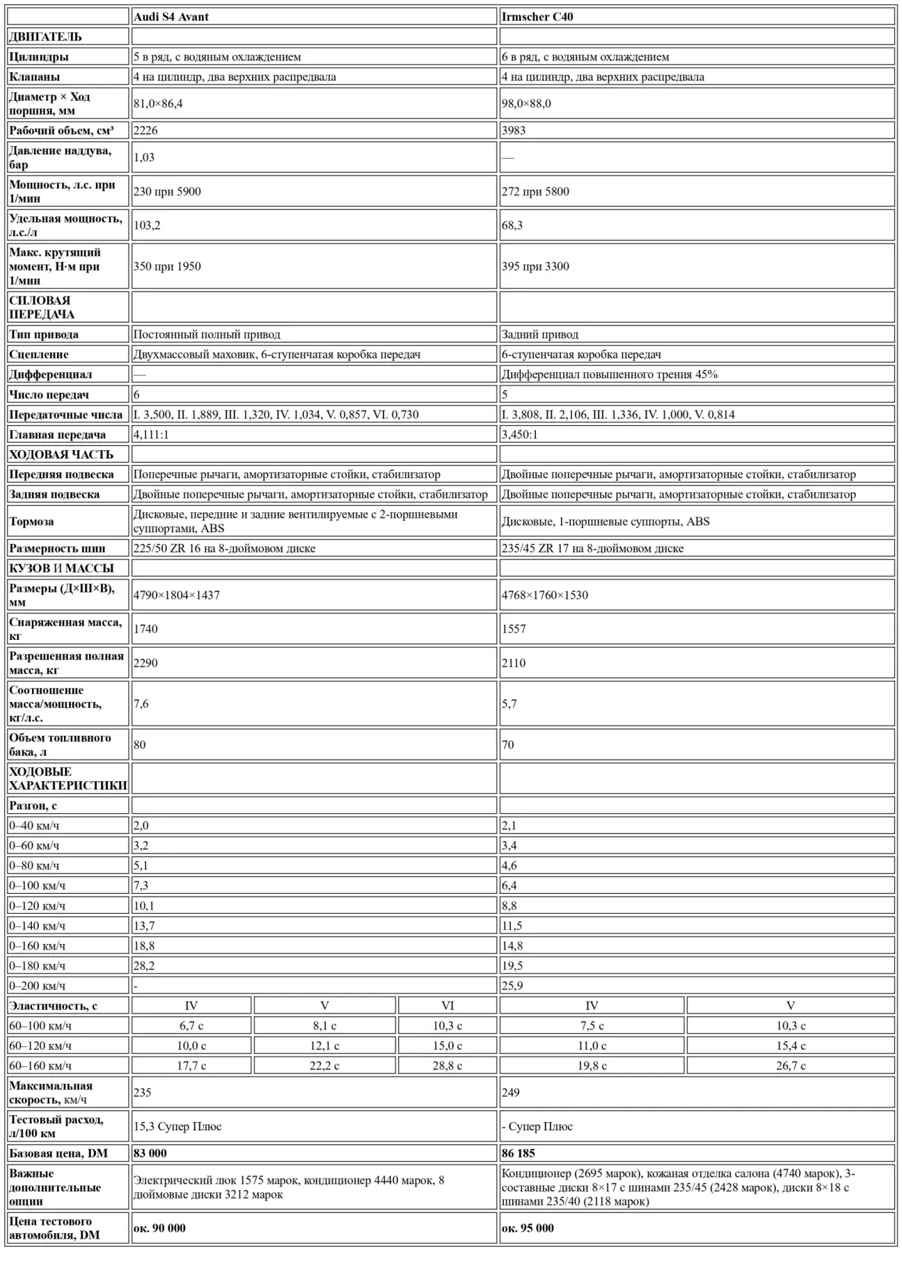 «Шепчущий» 5-цилиндровый двигатель серийной S4 Avant демонстрирует культуру работы столь же безупречно, хотя конструктивное происхождение едва ли могло быть более различным: 4-клапанный двигатель, установленный далеко в передней части кузова, в отличие от Irmscher-Omega действительно скупится на рабочий объем (2,3 литра), но отнюдь не на мощность (230 л.с.), чем он обязан общепринятому «допингу», именуемому турбонагнетателем. Пусть и не так спонтанно и субъективно впечатляюще, как Irmscher-Caravan, «брутальность» которой ощущается уже при «поглаживании» педали газа, но и S4 Avant начинает мощно работать уже на низких оборотах. Максимальный крутящий момент 350 Ньютон-метров доступен уже при почти 2000 оборотах, но он не оказывает такого заметного эффекта, как в «бычьей» Irmscher-Caravan.