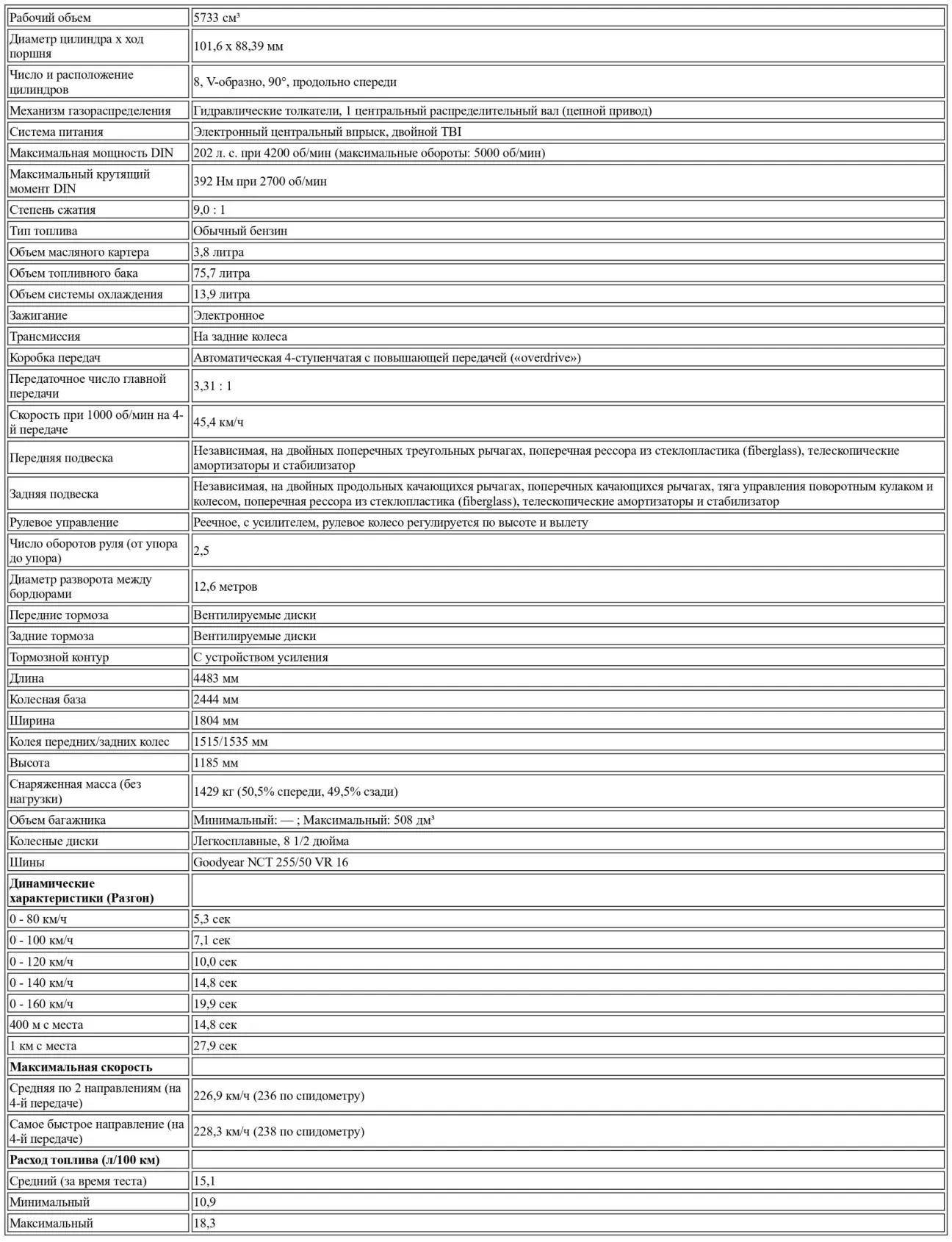 Что касается расхода топлива, завод не приводит никаких общепринятых данных при установившейся скорости, а у нас не было времени установить наши измерительные приборы. Бортовой компьютер, конечно, дает некоторые показания, но можно ли им доверять, зная, что в отношении среднего расхода его точность не является образцовой. Среднее значение нашего теста составило 15,1 л/100 км с крайними значениями от 10,9 до 18,3 л/100 км. На максимальной скорости компьютер показывает расход в диапазоне 28–29 литров на 100 километров и значения 7,5 и 10 л/100 км при реальных установившихся скоростях 90 и 120 км/ч. В любом случае, это, несомненно, очень заметное улучшение по сравнению с предыдущими моделями, крайние значения расхода которых обычно составляли 20–30 литров/100 км, а то и больше, если водитель был очень «тяжел на ногу». Правда, в то время передаточное число высшей передачи было примерно на 10 км/ч ниже, чем у сегодняшнего Corvette.