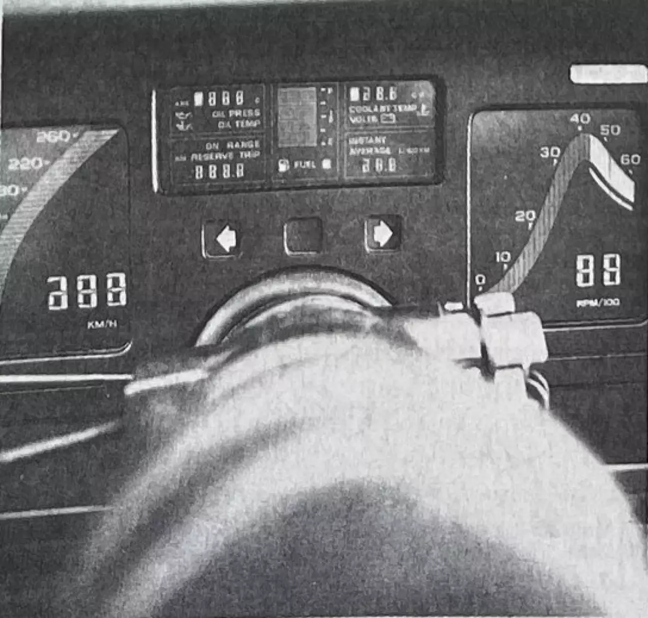 Тахометр и спидометр отображают как цифровые данные, так и графические кривые, но с небольшой задержкой в несколько секунд по сравнению с реальностью, что создает некоторые проблемы с оценкой при приближении к пределам скорости. Большинство других приборов имеют двойную функцию, которую водитель может вызвать на дисплей, манипулируя небольшими переключателями, расположенными немного далеко от водителя: давление масла или температура масла, температура охлаждающей жидкости или вольтметр, мгновенный или средний расход, пройденный или оставшийся пробег после последней заправки — на выбор.
