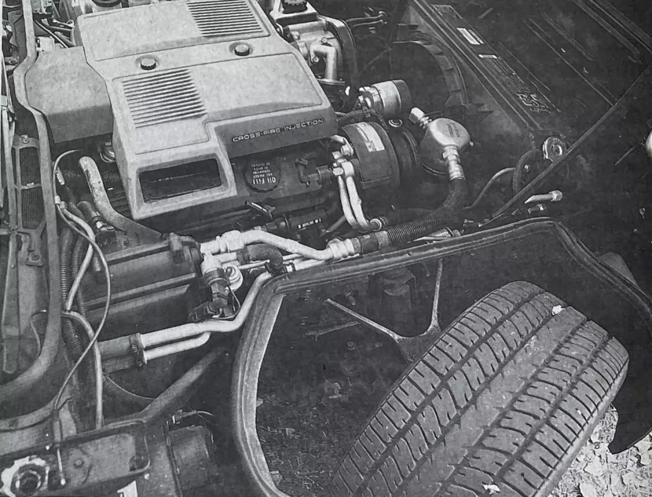 Под огромным капотом, который полностью открывает всю переднюю часть, — небольшое разочарование: двигатель представляет собой всего лишь «хороший» V8 из чугуна, увенчанный крышками клапанов и воздушным фильтром из... магния. Этот проверенный 8-цилиндровый двигатель, с верхним расположением клапанов и рокерами, а также центральным распределительным валом с цепным приводом, развивает скромную для рабочего объема 5733 см³ мощность 202 л. с. при 4200 об/мин и обеспечивает крутящий момент 392 Нм при 2700 об/мин. Подача топлива возложена на систему центрального впрыска, называемую «throttle body» — своего рода «карбюратор» с впрыском, подача бензина которого контролируется электронным модулем, который также управляет зажиганием. Однако версия 85 года Corvette, помимо менее жесткой подвески и слегка переработанной приборной панели, получит систему многоточечного впрыска («multipoint»), которая обеспечит увеличение мощности порядка 10–15%, то есть максимум в диапазоне примерно от 218 до 231 л.с. (окончательные данные для европейской версии еще не установлены, в то время как модель для США будет иметь 233 л. с. по стандарту SAE нетто и традиционный каталитический нейтрализатор в системе выпуска для соответствия местным нормам по борьбе с загрязнением).