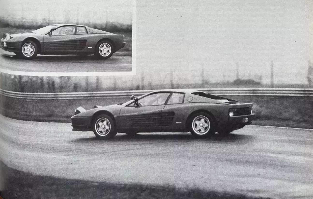 Даже когда предел сцепления не превышен, Testarossa хорошо реагирует на акселератор, стремясь затянуть траекторию при уменьшении подачи топлива, — характеристика, которая оказалась очень полезной в длинном правом повороте, наклоненном в неверную сторону, где, как писал Дидье Пирони в журнале «Sport Auto», даже автомобили Формулы 1 имеют тенденцию неприятно недостаточно поворачивать. В остальном, только шпилькообразные повороты заставляют Testarossa недостаточно поворачивать, что нормально на мокрой дороге для быстрого автомобиля, оснащенного самоблокирующимся дифференциалом. Но хорошо дозированное нажатие на акселератор на выходе из поворота быстро выравнивает автомобиль и катапультирует его вперед. Во всех остальных обстоятельствах Testarossa демонстрирует практически нейтральное поведение, на которое, однако, можно влиять с помощью акселератора так, как мы описали. Баланс автомобиля в самом быстром повороте трассы, на пределе сцепления всех четырех колес, был впечатляющим. Поведение Testarossa гораздо больше напоминает поведение гоночного, чем дорожного автомобиля, настолько оно точное и настолько велика ее маневренность, что, несомненно, обусловлено низким полярным моментом инерции и жесткостью связи между колесами и кузовом.