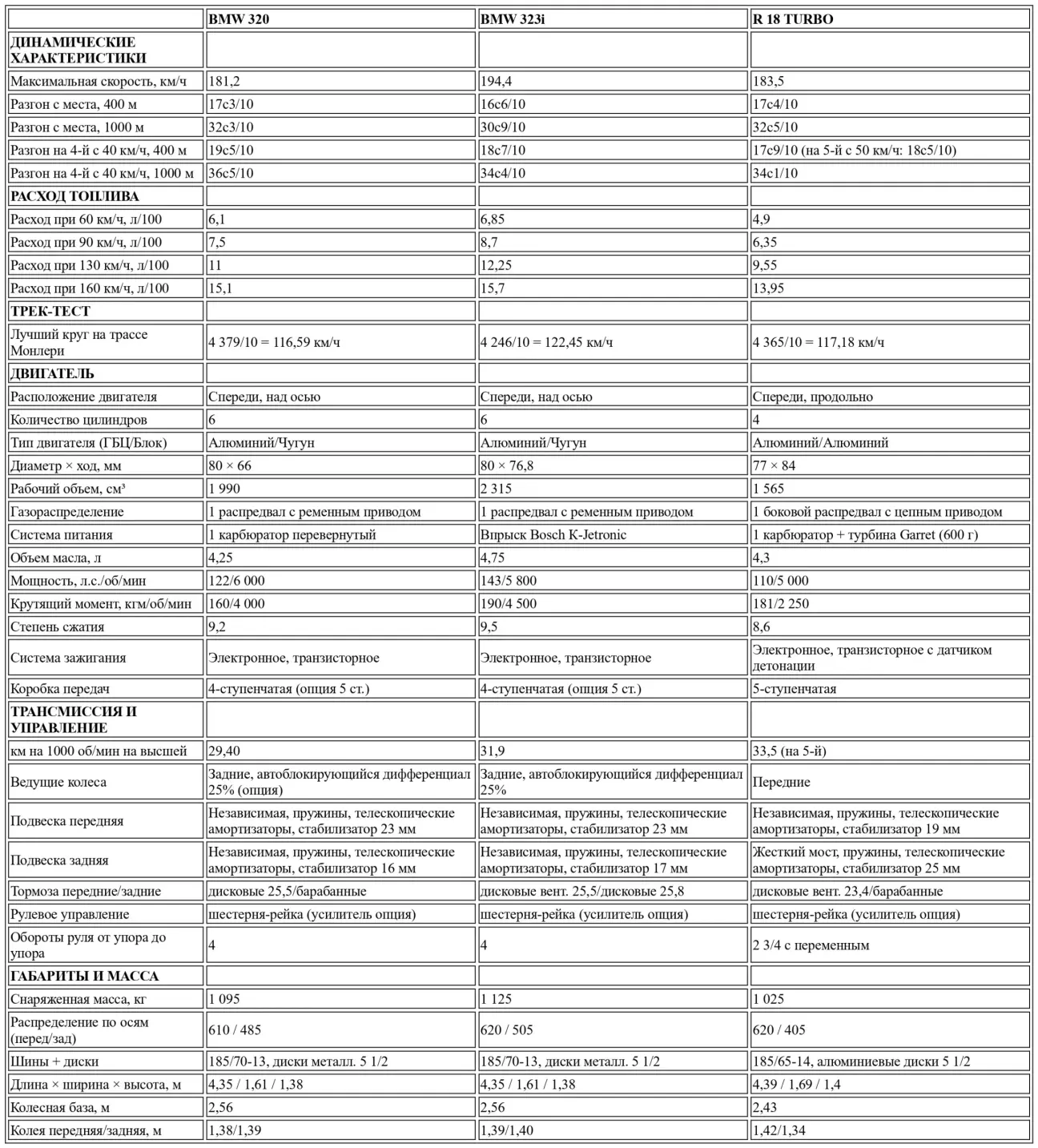 Но, в конечном счете, именно сравнение цифр и результатов должно «отобрать» победителя. 110 л. с. для R18, 122 л. с. для 320 и 143 л. с. для 323. Если учитывать рабочий объем, то это дает нам литровую мощность 70,28 л. с. для французского автомобиля против 61 л. с. для 320 и 61,7 л. с. для 323. Относительно проверенной массы автомобилей — с полным баком — мы получаем мощность на тонну 107,3 л. с. для 18-й против 111,4 л. с. для 320 и 127,1 л. с. для мощной 323i.
