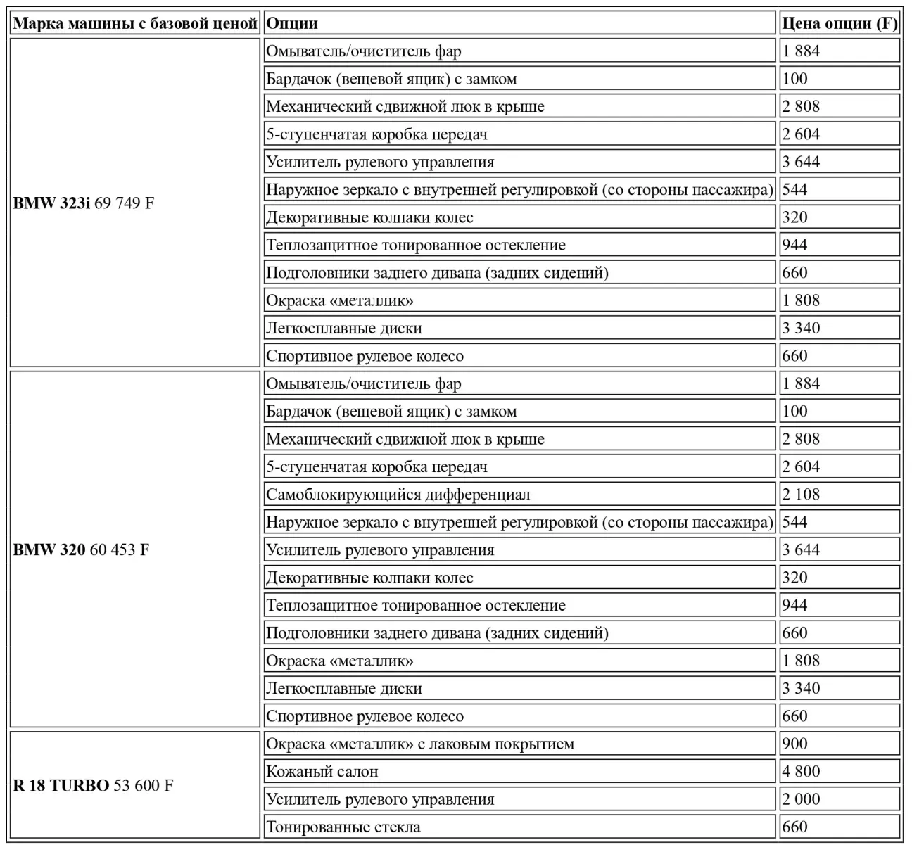 Как составить точный и объективный «отчет»? Изначально я хотел просто сравнить 18 Turbo с BMW 320. Затем меня «потянуло» присоединить к обсуждению 323 в качестве «наблюдателя». Впрочем, сравнение цен уже показывает небольшую «пропасть», которая отделяет французский автомобиль — 53 800 F — от 320, продаваемой за 90 463 F, и 323, предлагаемой аж за 99 749 F, и это не считая 9 432 F, которыми «карается» опциональное оснащение автомобилей из-за Рейна...