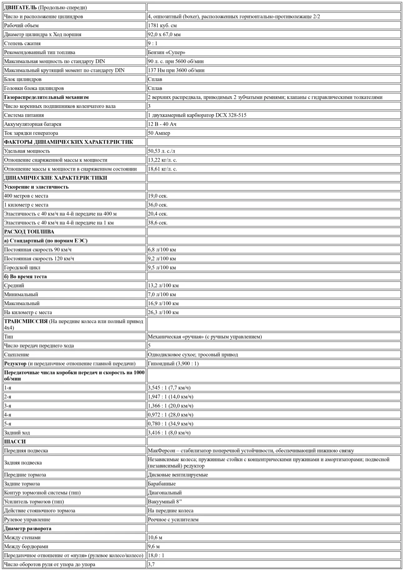 Наши тесты эластичности принесли нам второй сюрприз. Мы ожидали получить в цифрах эффекты эластичности, которая должна была быть. Однако автомобиль, который был у нас в руках, показал себя относительно «динамичным» в самый первый момент, чтобы затем немного потерять свою «энергию», затем снова обрести «блеск» и «задохнуться» при приближении к 5600 об/мин. Таким образом, мы не могли сомневаться в том, что двигатель 1800 является «жертвой» определенной слабости на средних оборотах. Замер мощности на мощностном стенде это подтвердил. Кривые мощности и крутящего момента показывали извилистые изменения, с двумя благоприятными пиками, разделенными между 4000 и 4500 об/мин. Приведем здесь время, полученное во время этих тестов: 20,4 и 38,6 сек для преодоления 400 и 1000 м при старте с 40 км/ч на четвертой передаче (почетные, не более того!) и 22,4 и 43,1 сек на пятой передаче (разочаровывающие для 1800-го). На практике «новый» оппозитный 1800 демонстрирует приятную эластичность. Он терпит самые низкие обороты, на которых он «развивается» без «рывков» и в идеальной бесшумности. Он «исполняет свою работу» со всеми «почестями», но без «блеска». Таким образом, у него есть «очарование»... слишком «скромное».