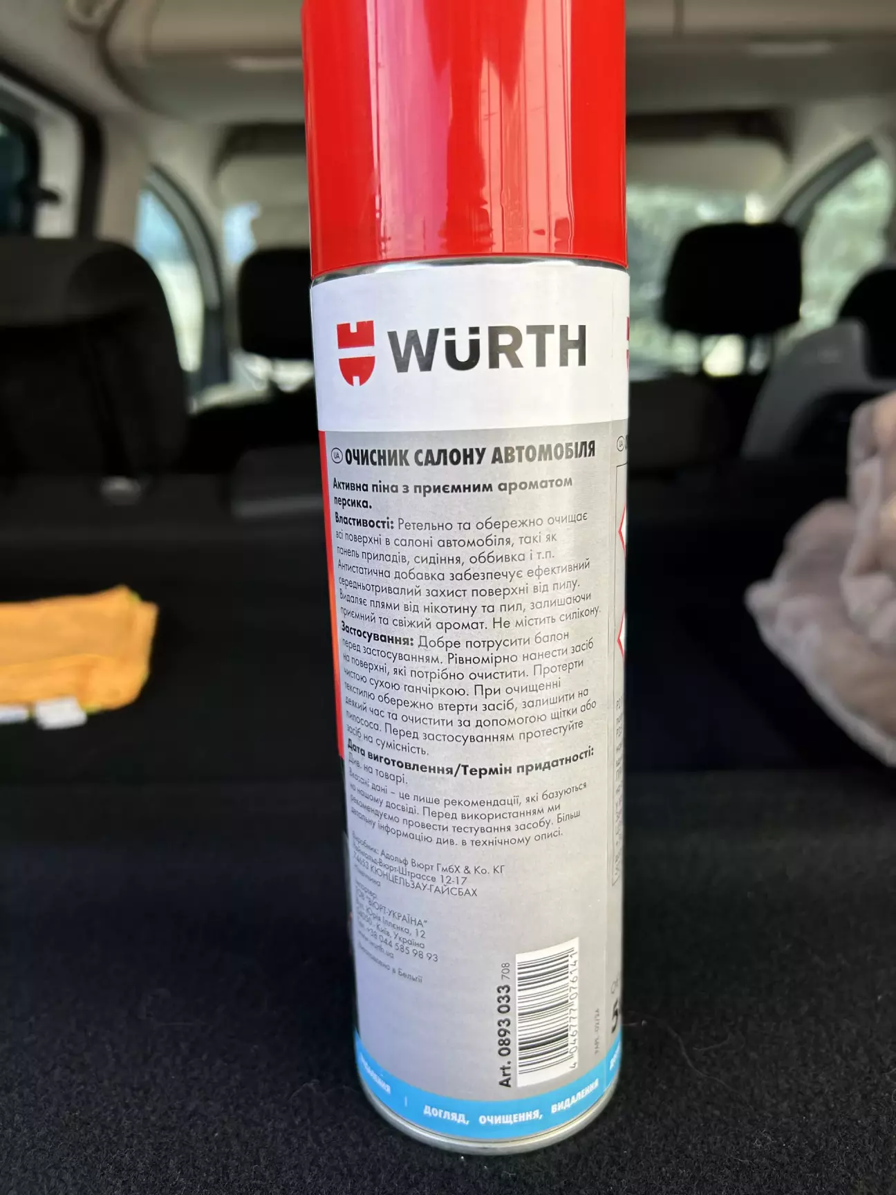 Для початку вирішив не вдаватись до важкої арти у вигляді миючого пилосмока,а спробувати пінний очисник салону Wurth. Радили мені його вже давно,ціна питання не космічна та і часу роботи з ним менше,ніж з пилосмоком.