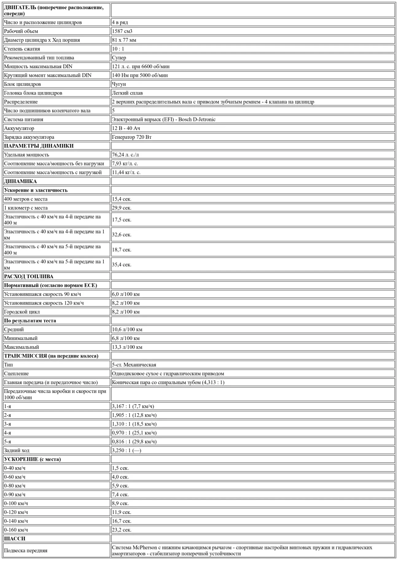 Вся эта, несомненно, хорошо продуманная конструкция позволила обеспечить этому переднеприводному автомобилю очень здоровую устойчивость на дороге и невероятную стабильность на высокой скорости. Конечно, подвеска оказывается жесткой и спортивной и, кажется, не слишком любит проезд поперечных швов, особенно на задней оси, что выражается в легком срыве. В крутых поворотах автомобиль хорошо опирается на внешнее колесо, не разгружая при этом внутреннее, и на пределе просто отмечается легкое начало недостаточной поворачиваемости, с которой можно бороться, вызывая легкий занос задней оси путем резкого отпускания педали акселератора. Большие дуги, как правило, проходятся с педалью в полу и очень нейтрально. Маневренность такова, что кажется, будто находишься за рулем карта. Добавим также, что очень точное рулевое управление позволяет в любой момент ощущать контакт колес с дорогой.