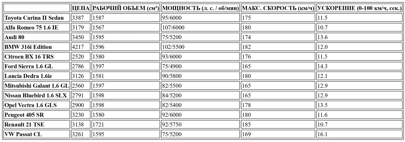 Вернемся, однако, к главной теме этого теста, чтобы попытаться определить место Carina среди ее конкурентов. Прежде всего, следует признать, что это не один из самых дешевых продуктов в этом сегменте — пальма первенства достается BX 16 TRS и неожиданному Mitsubishi Galant 1.6 GL. Но, с другой стороны, Carina также не является и самой дорогой, легко позволяя себя обойти Audi 80 и BMW 316i Edition. Между теми и другими существует большое количество предложений почти от всех производителей (ведь это один из самых ожесточенных рынков), где главное оправдание для различных цен также кроется в уровне предлагаемого серийного оснащения. И именно в этой главе Carina котируется на отличном уровне, располагая довольно полным оснащением, что обеспечивает ей выгодное соотношение цены и оснащения.