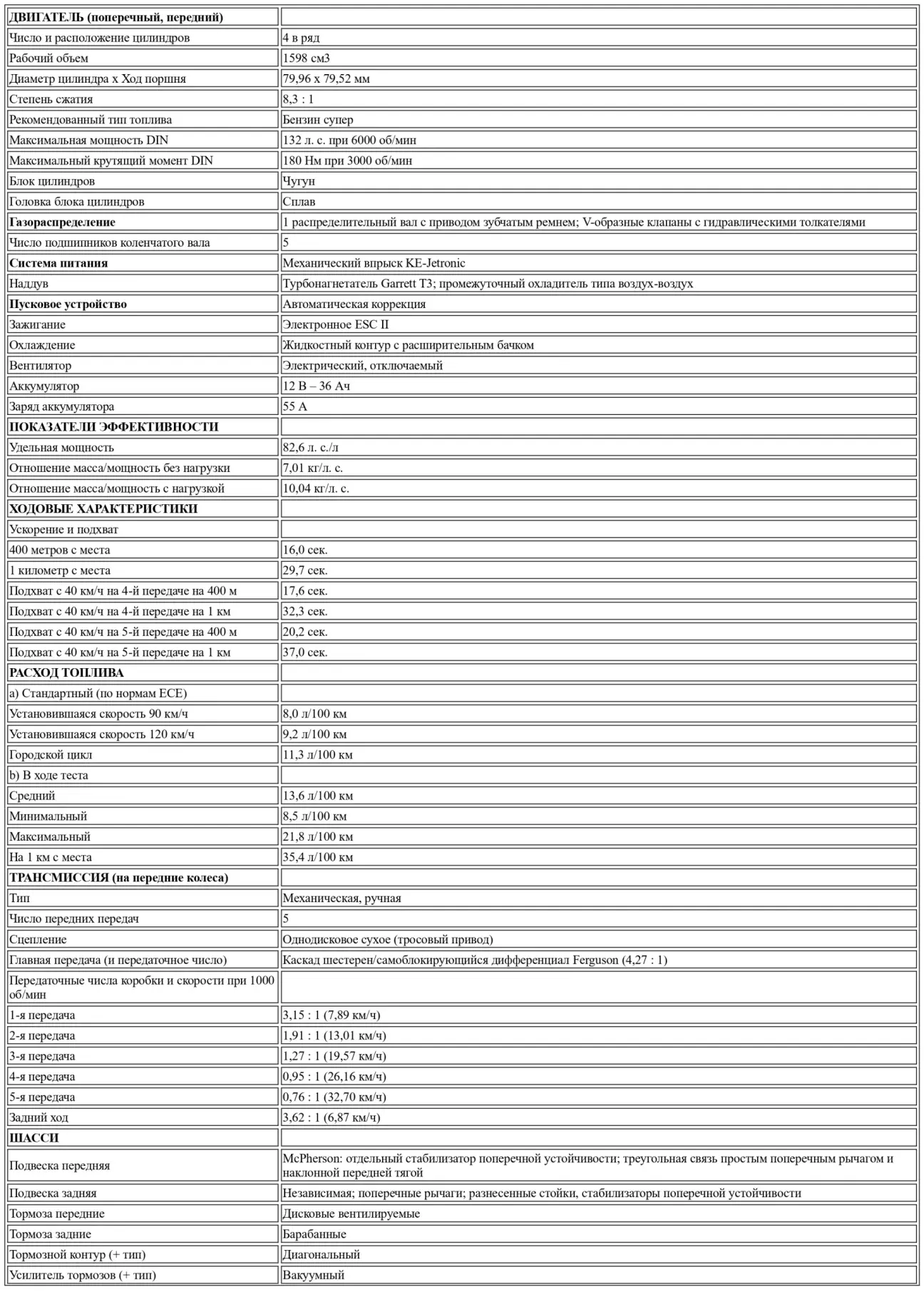 Новый Ford Escort RS Turbo — это эволюция знаменитого 3-дверного Escort, которую можно было бы поместить на полпути между XR3i и 1600 RSi. Он позиционируется как спортивный автомобиль и мог бы добиться хороших спортивных результатов без больших доработок. Кузов — это кузов XR3i, а механическая часть расположена спереди, поперечно. Двигатель — это новая версия 1.6 CVH, адаптированная под турбонагнетатель, что увеличивает его мощность до 132 л. с. DIN при 6000 об/мин с эффективным крутящим моментом 180 Нм при 3000 об/мин. Трансмиссия — это трансмиссия XR3i, но со слегка удлиненным главным передаточным числом (что объясняется использованием турбонагнетателя, который, как правило, демонстрирует высокий крутящий момент). Но главное — в мосту по умолчанию используется система ограниченного проскальзывания типа Ferguson.