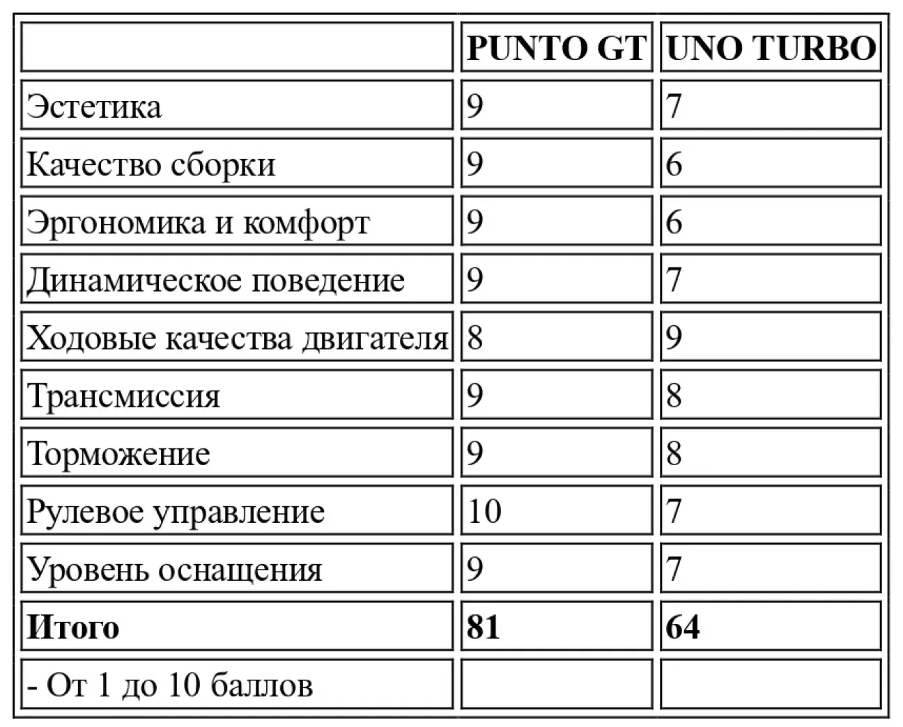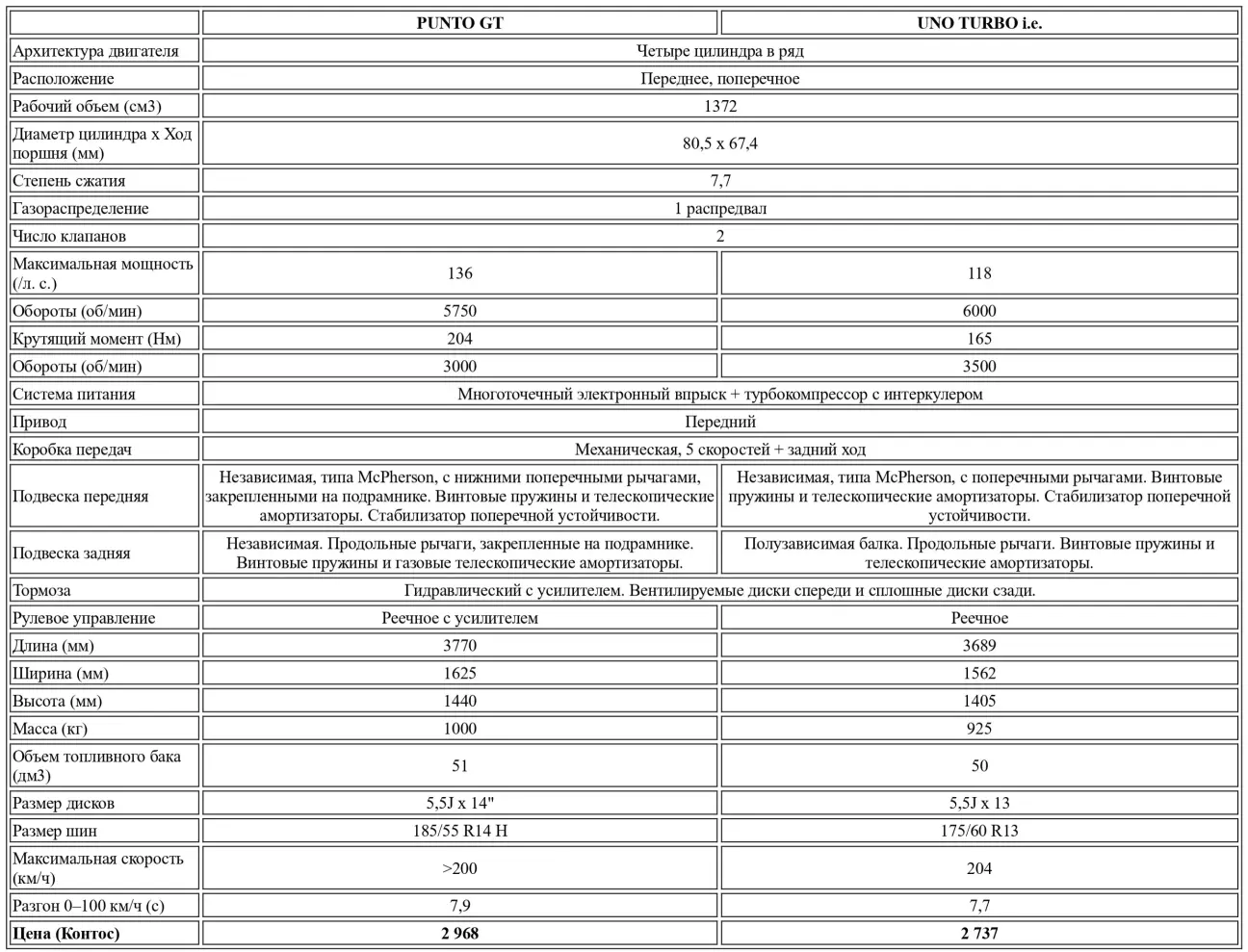 Как и в других ситуациях, между Punto GT и Uno Turbo i.e. существует огромный «идеологический разрыв». Новые концепции, новые приоритеты и, прежде всего, новые коммерческие реалии, характеризуют два сравниваемых образца. Хотя они не обязаны подвергаться «принудительному сосуществованию», Punto GT и Uno Turbo во многих случаях переживают настоящий «конфликт поколений». Рассмотрим, как все происходит.