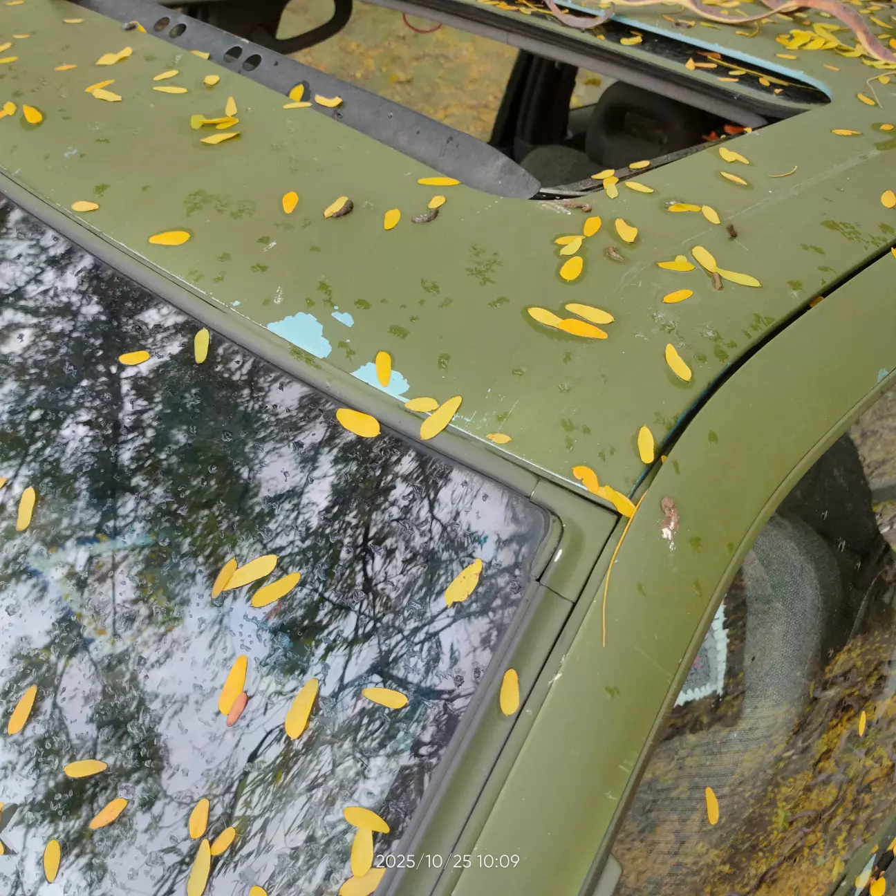 Зранку відчинив двері — аромат свіжості, листя на сидіннях, крапельки дощу блищать…