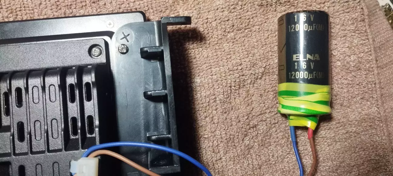 Перші доопрацювання. Впаяв конденсатор на 12000 мкФ, фірмовий audio ELNA, правда б/у. В корпус магнітоли він не вліз.