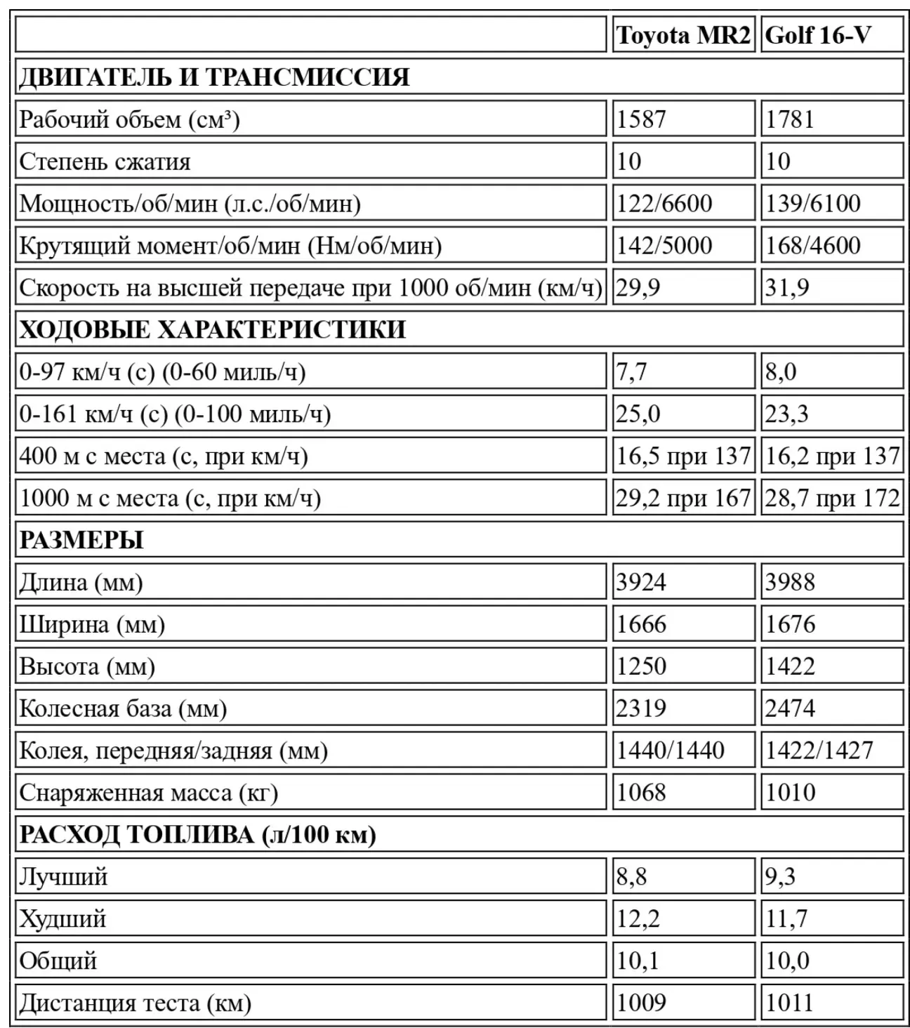 MR2 показала худший расход топлива, чем Golf, но это не стало неожиданностью. Golf начинает по-настоящему ехать только после 5000 об/мин. Ниже этой отметки он теряет резвость, и за 1609 км (100 миль) мы редко могли водить его на максимуме. MR2 же просит, чтобы ее водили агрессивно. Легко раскручивающийся двигатель быстро и неудержимо тянет к вершине. Учитывая это, общий расход 10,4 л/100 км весьма респектабелен. На автомагистрали и главных дорогах мы смогли достичь менее 9,1 л/100 км, в то время как 12,3 л/100 км отражали активную езду по горной местности. Golf показал 9,4 л/100 км на автомагистралях и 11,8 л/100 км на горной местности. Владельцы получат расход, разумеется, меньший.