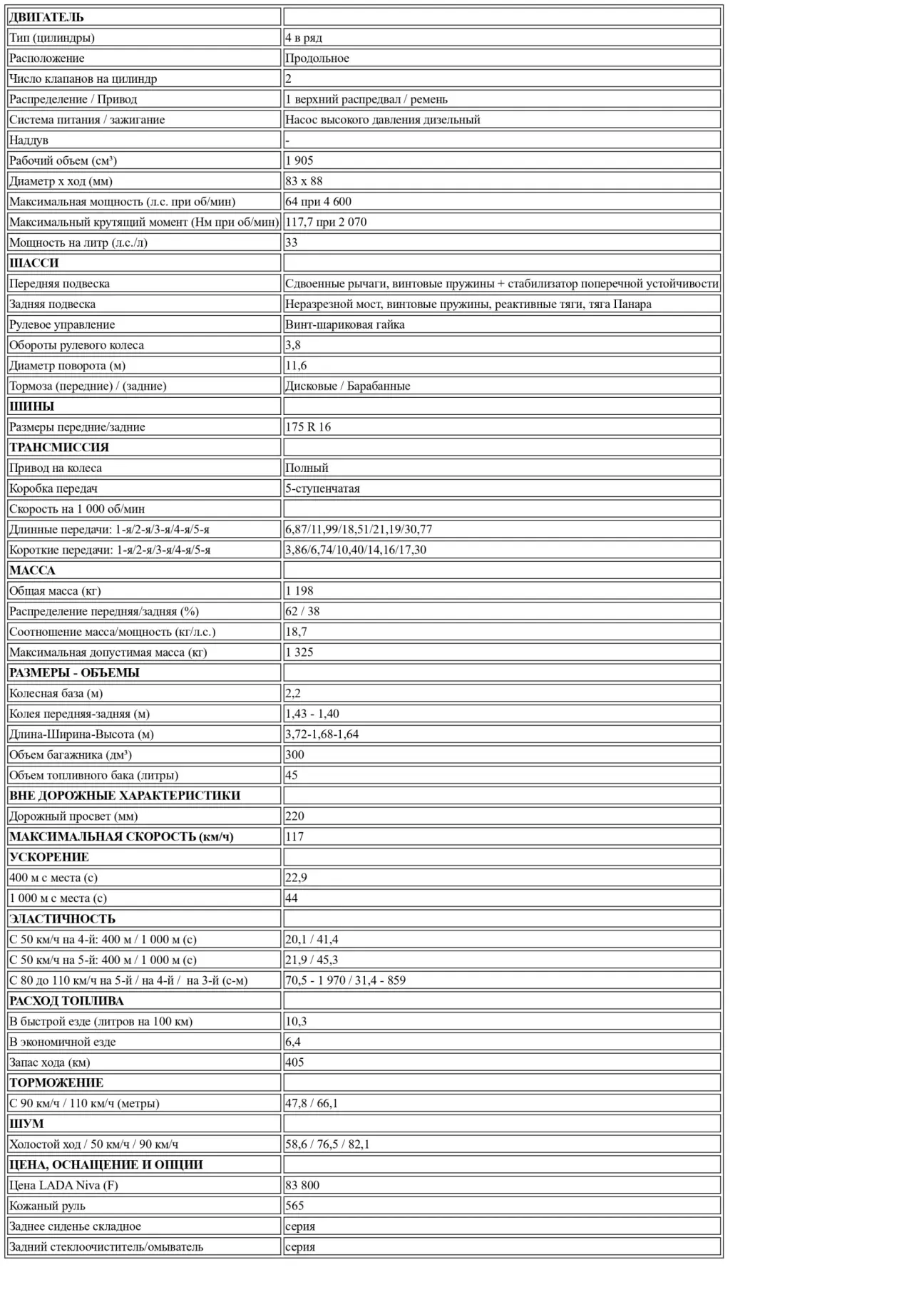 Вот она наконец. Этот двигатель хорошо известен во Франции, поскольку это 1 905 см3 группы PSA, используемый на всевозможных Peugeot и Citroën. Неприятный сюрприз: этот новый «франко-русский» автомобиль является дорогим удовольствием: его цена подскочила до 83 800 F, в то время как традиционная NIVA 1.6 бензиновая остается ниже отметки 60 000 F. Эту наценку тяжело принять. Тем более, что ходовые качества, предлагаемые этим дизелем мощностью 64 л. с., ничуть не превосходят бензиновую версию (за исключением расхода топлива, конечно), и что маленькая Lada нисколько не продвинулась вперед в плане отделки и комфорта.